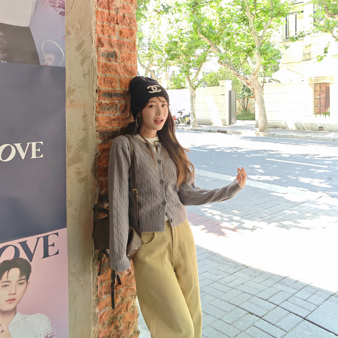 麻花开衫毛衣女外套秋冬内搭学院风卡其色针织衫小个子短款上衣