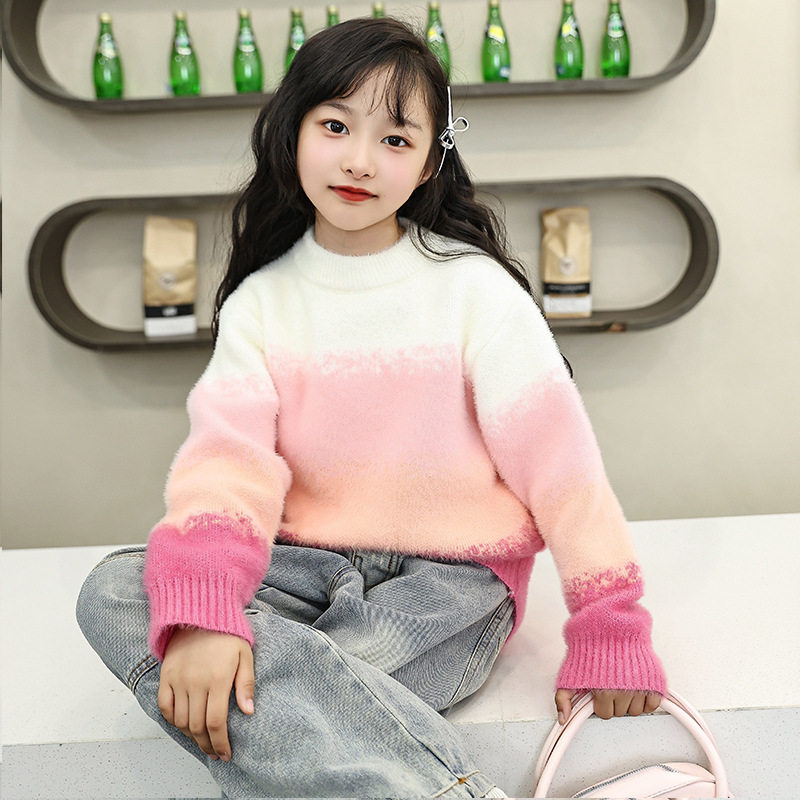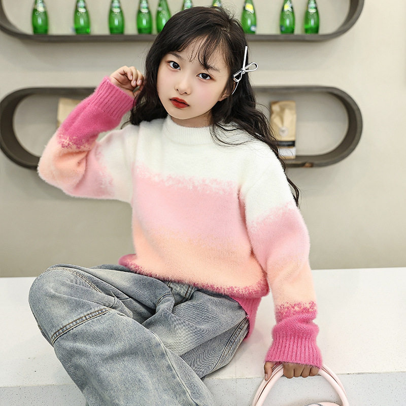 女童水貂绒毛衣秋冬2025新款中小童冬季洋气加厚圆领针织打底衫