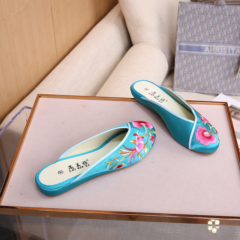 高美雅新款植物平底软底防滑汉服湖蓝花卉高端缎面绣花居家拖鞋