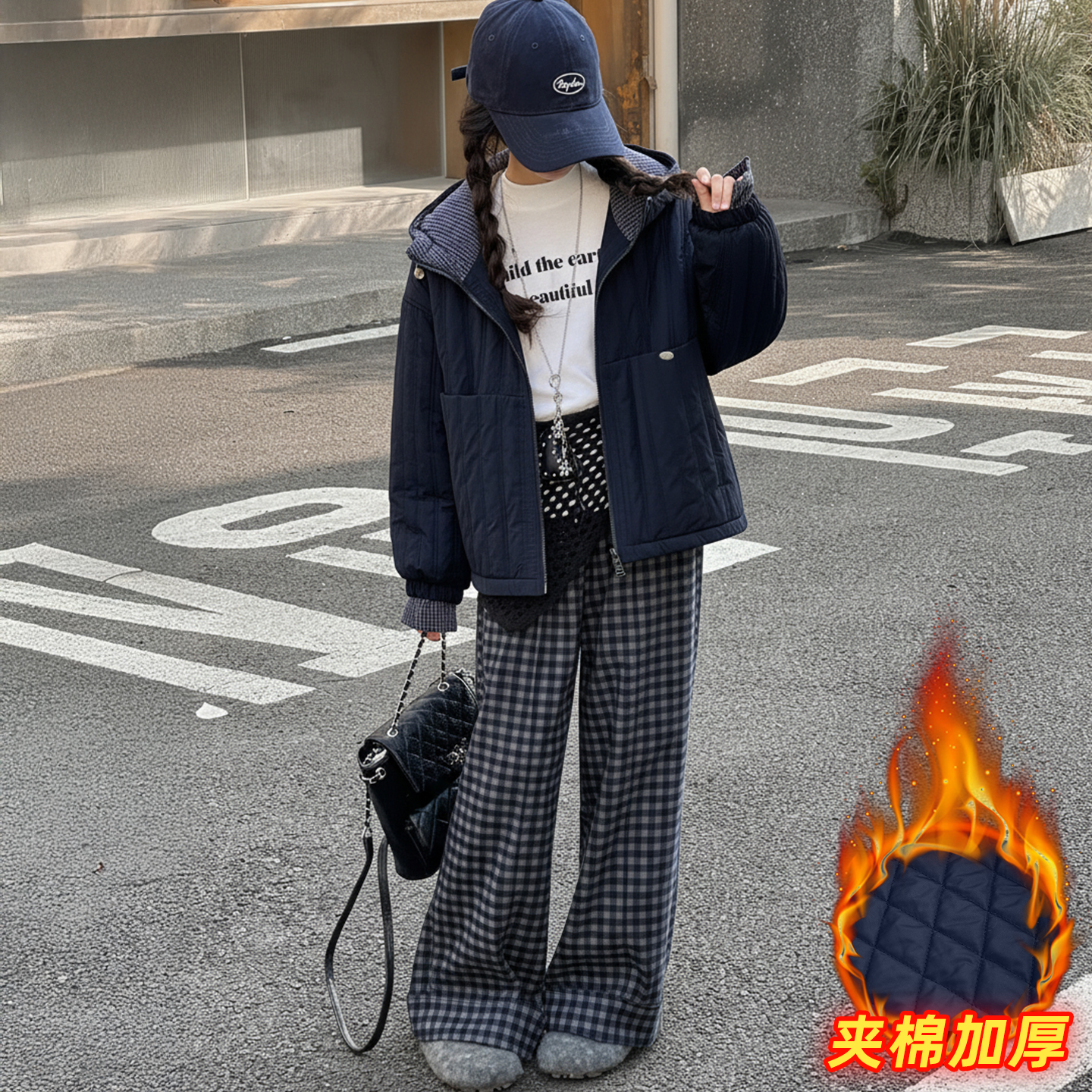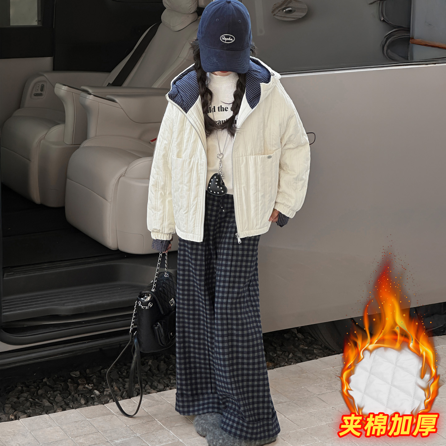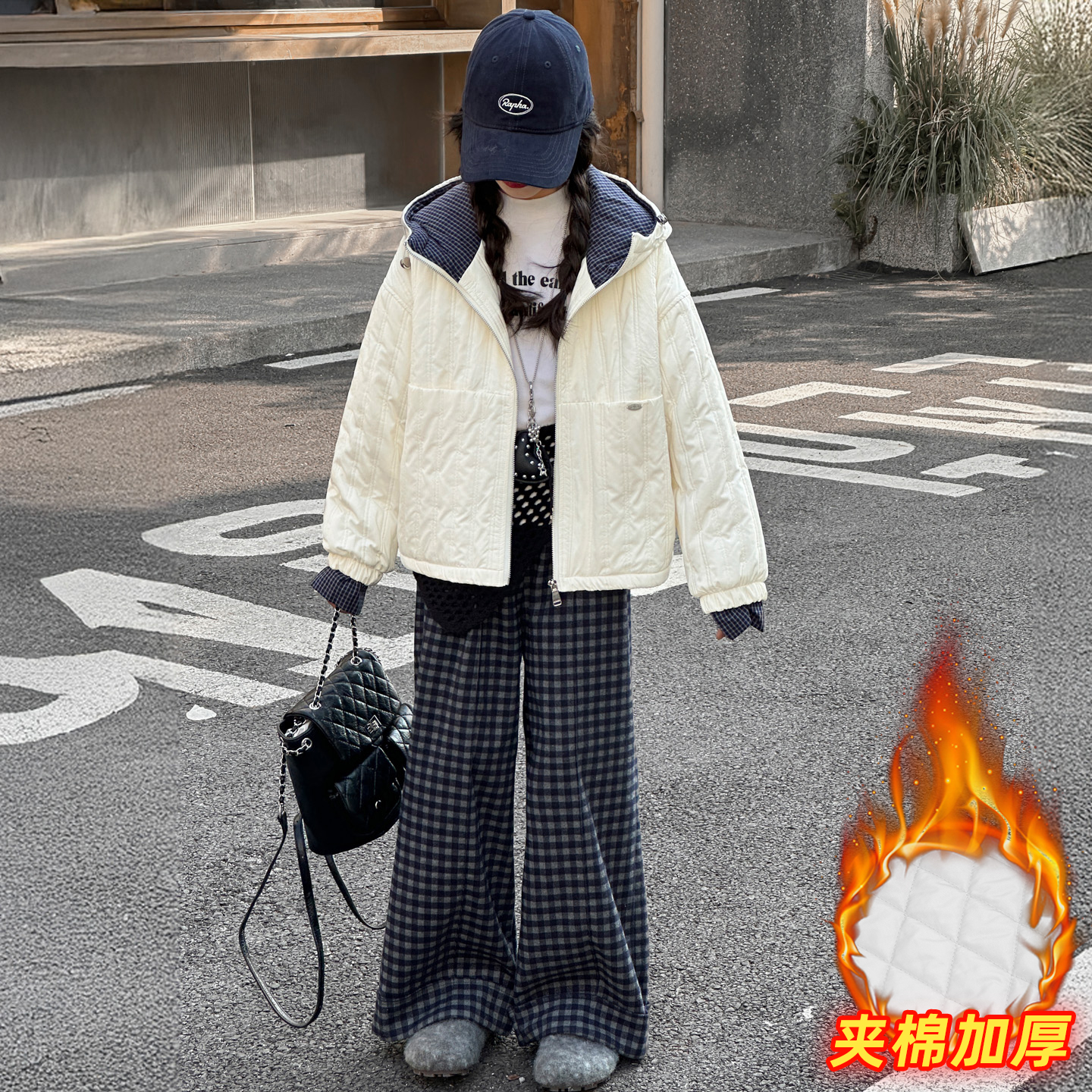 女童夹棉外套秋冬季2025新款儿童加厚棉衣大童冬装保暖连帽棉服潮