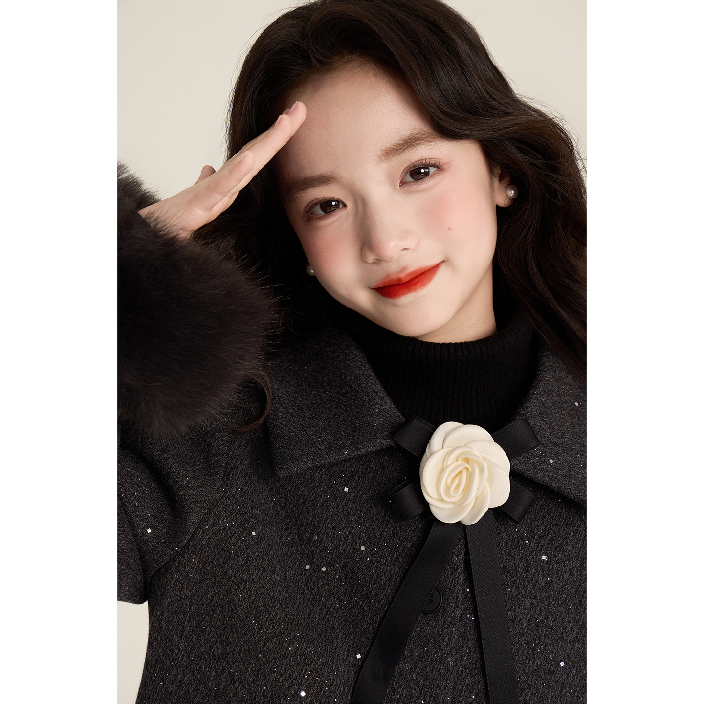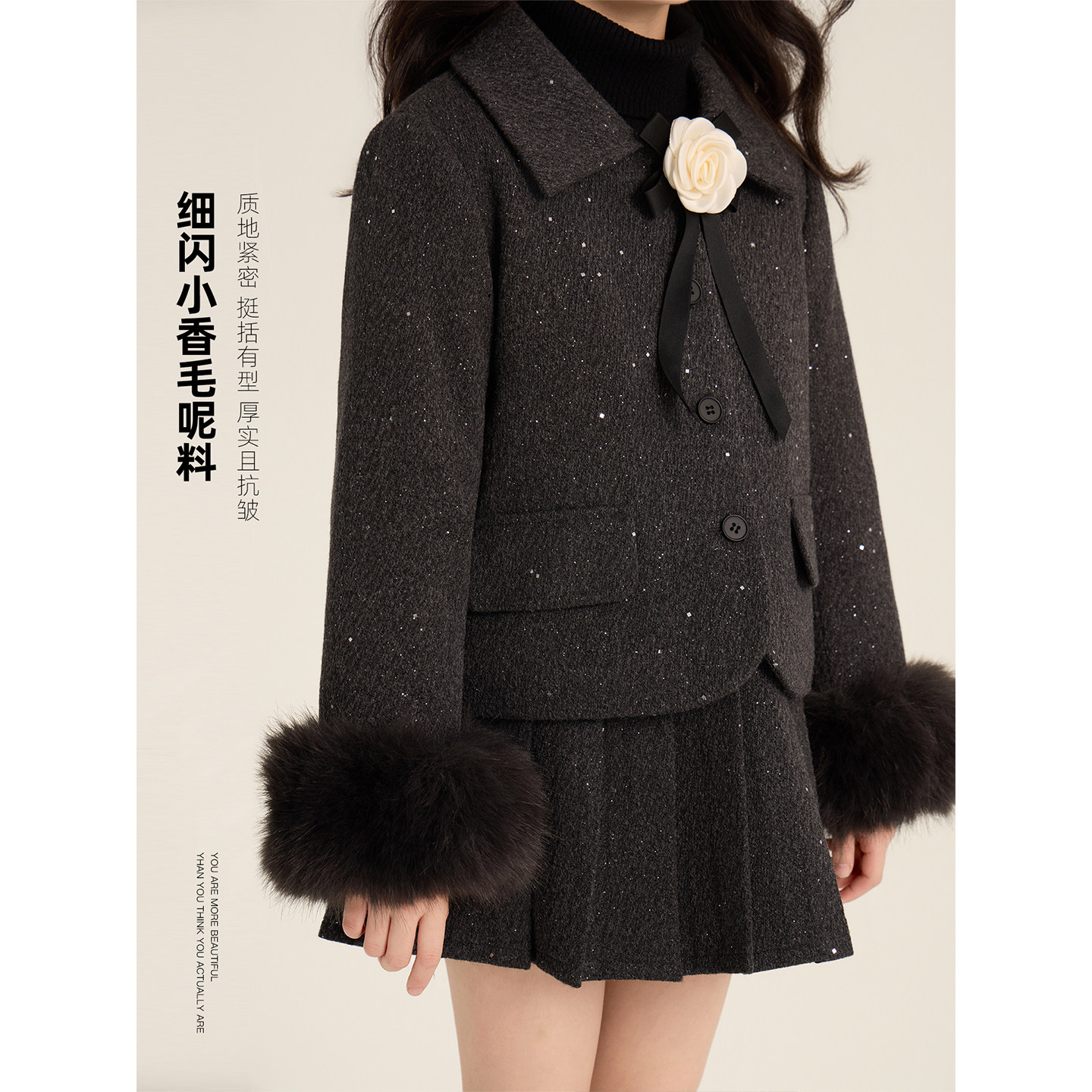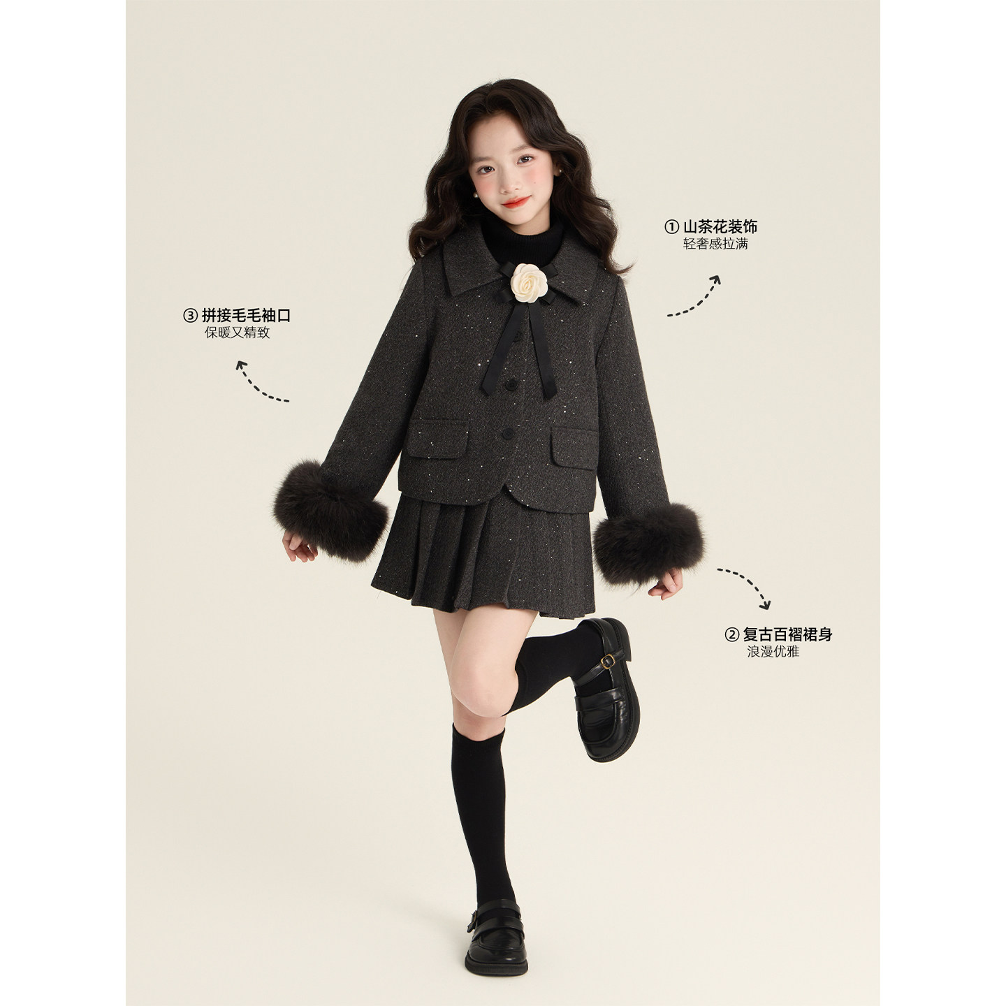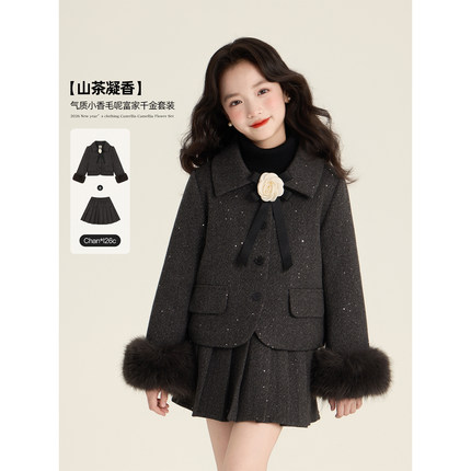 Amybaby女童套装冬季2025新款气质千金小香风山茶花外套半身裙