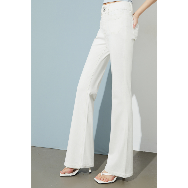 DPLAY2025秋季新款白色牛仔裤女高腰双排扣简约微喇长裤喇叭裤