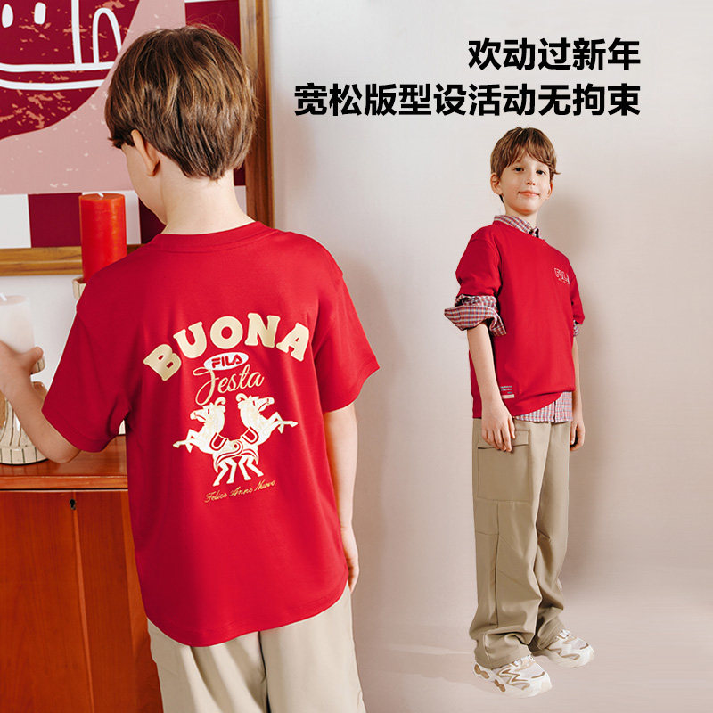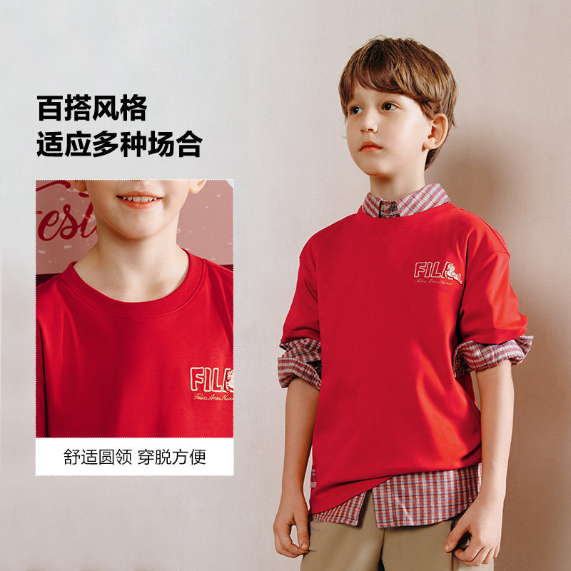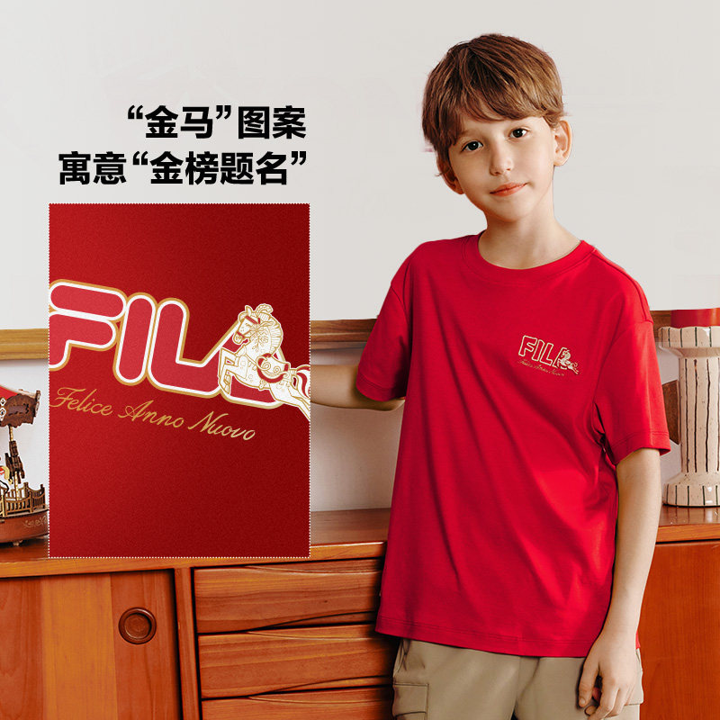 FILA斐乐儿童短袖T恤2026年春季新款男童中大童新年款红色上衣