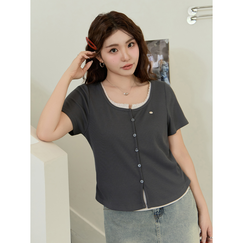 小波家2025夏季胖mm韩系纯欲蕾丝拼接方领短袖修身上衣