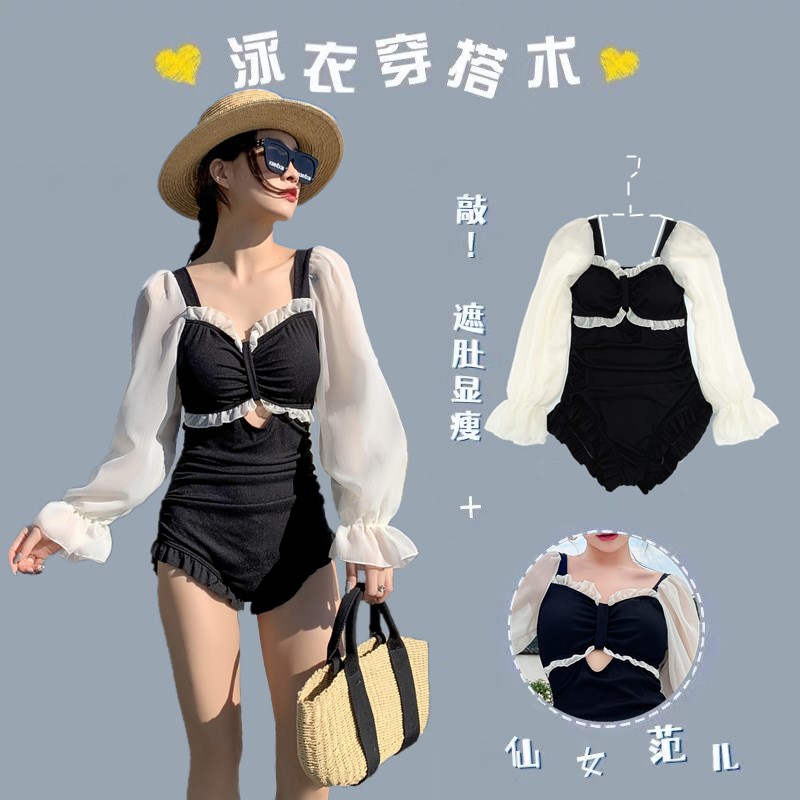 泳衣女2024款长袖防晒连体性感小胸聚拢显瘦学生仙女范温泉泳装