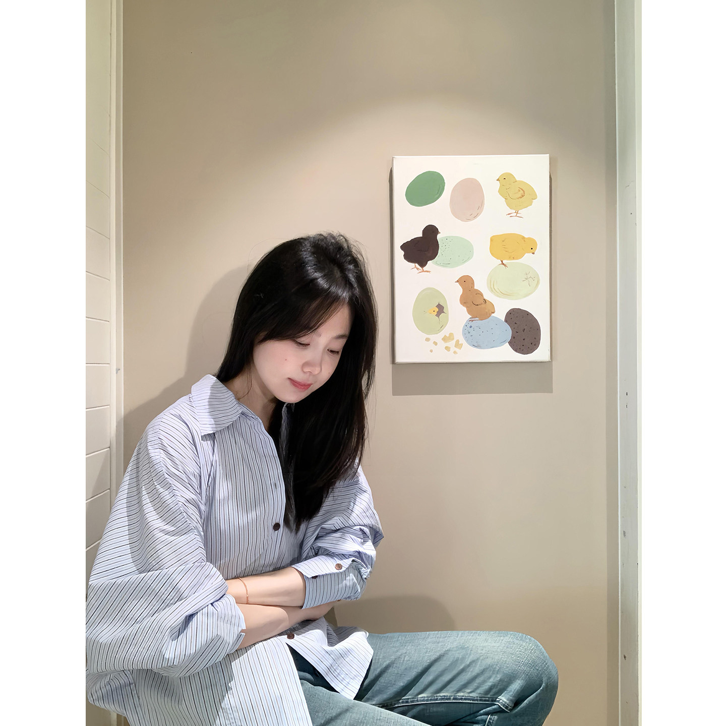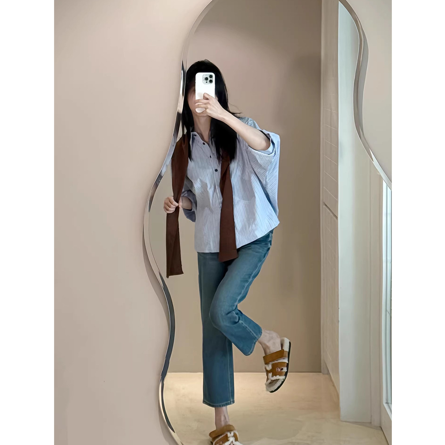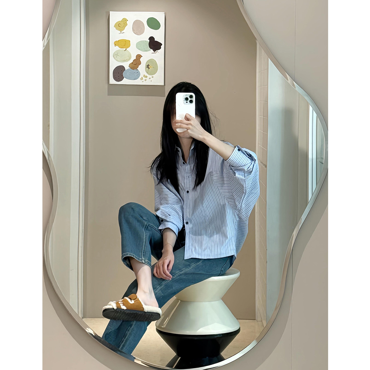 韩系学院风设计感Polo领蓝色条纹长袖衬衫女2026春季新款宽松上衣