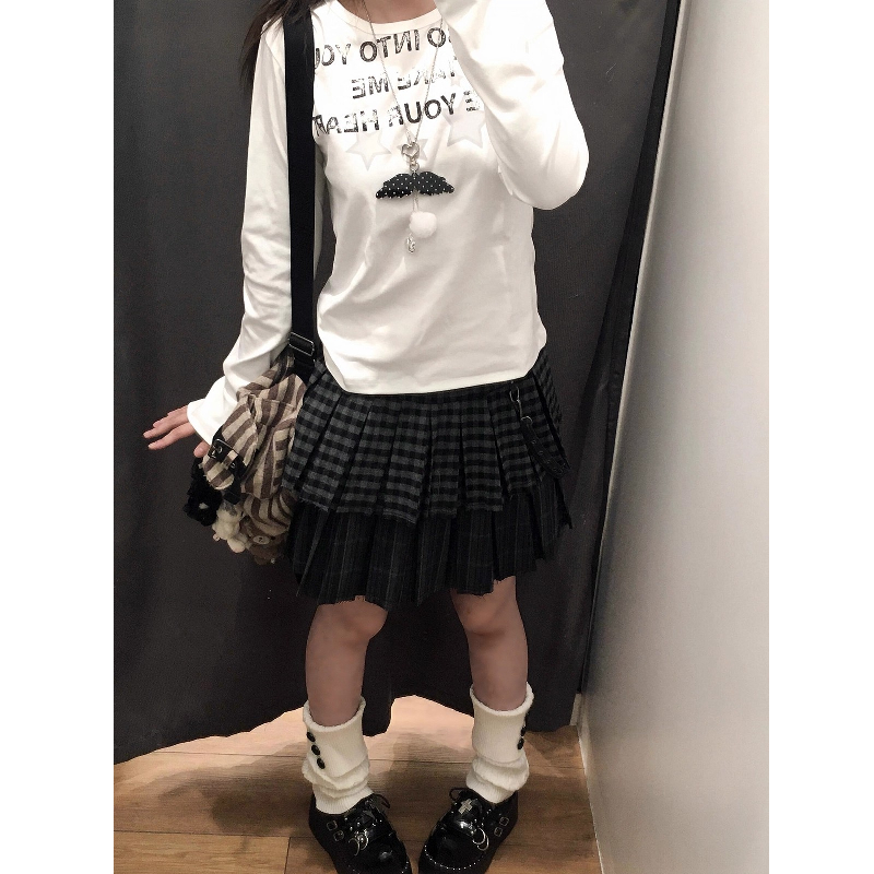 韩系复古字母印花正肩长袖T恤女秋季白色内搭修身显瘦打底衫上衣