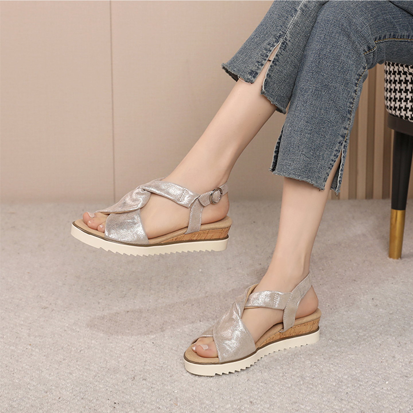 德国坡跟女鞋舒适真皮交叉凉鞋