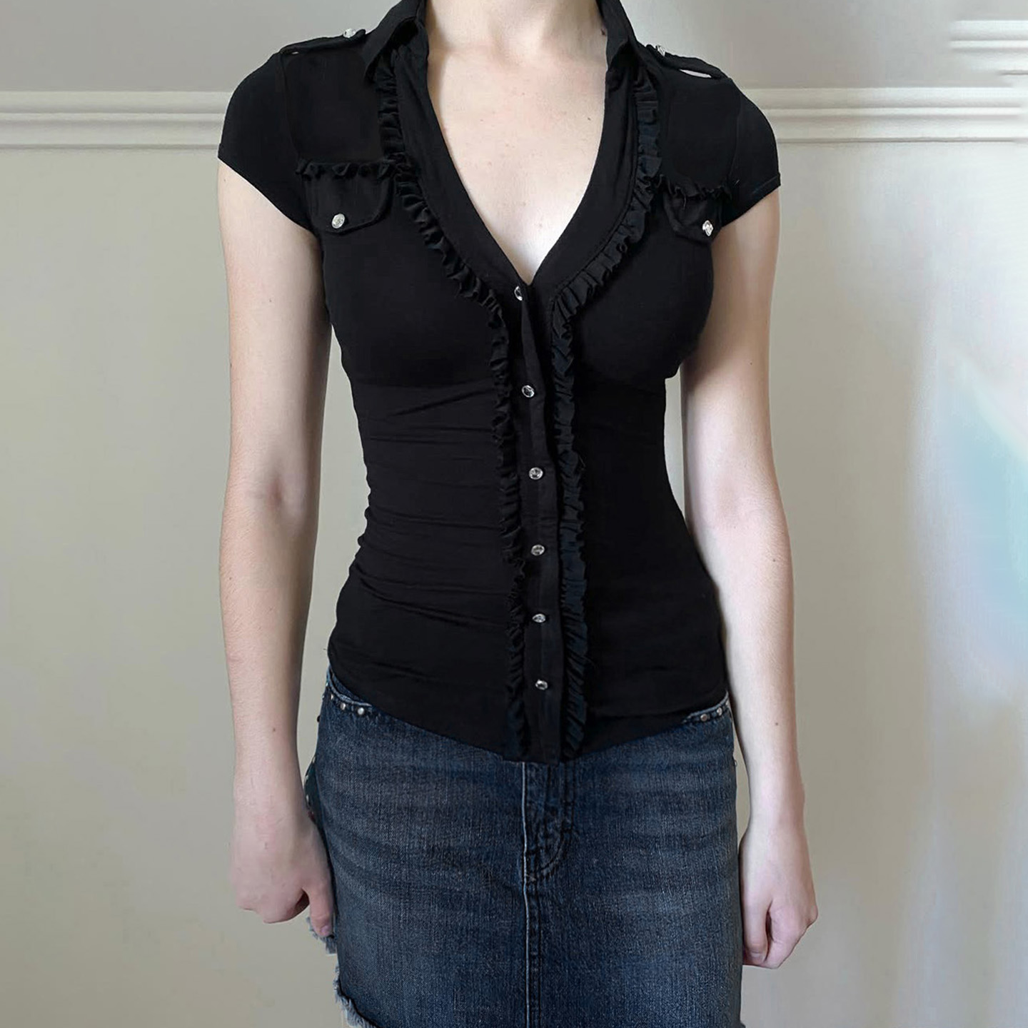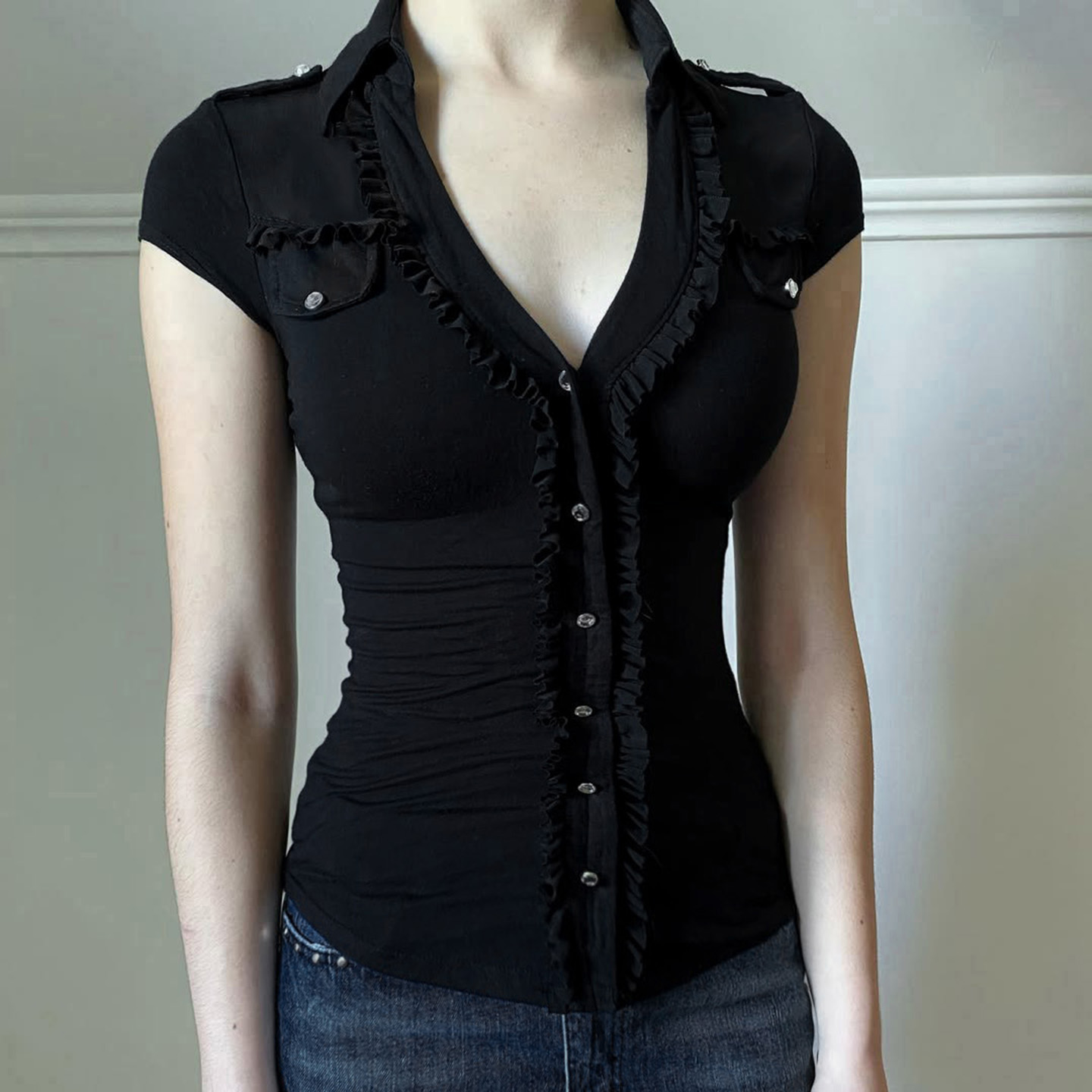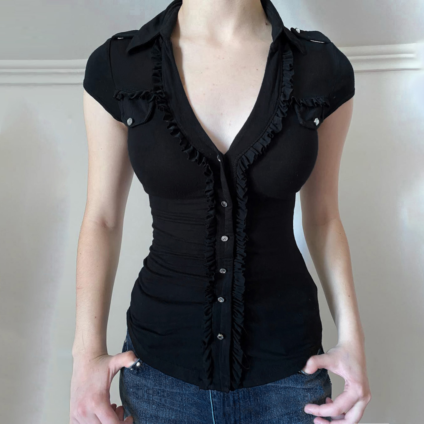 Amyway【美式辣妹】复古性感V领短袖T恤女束腰显瘦纽扣短袖上衣