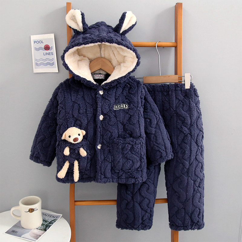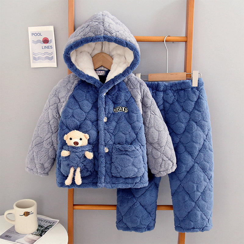 儿童睡衣冬季夹棉三层珊瑚绒套装加厚保暖大童男孩连帽男童家居服