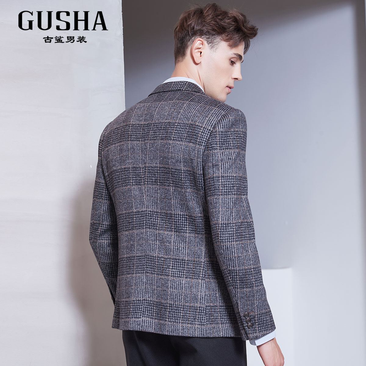古鲨英伦格纹羊毛休闲西服