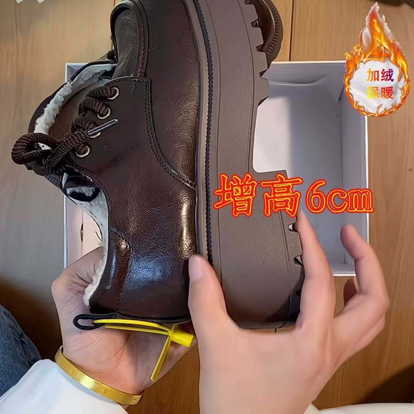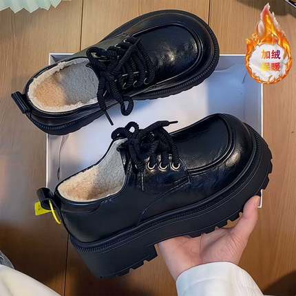英伦风小个子厚底增高鞋女黑色圆头系带加绒保暖小皮鞋防滑厚底鞋