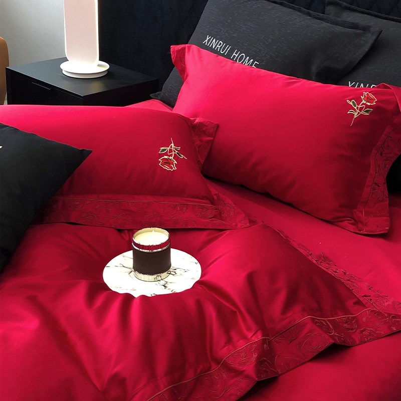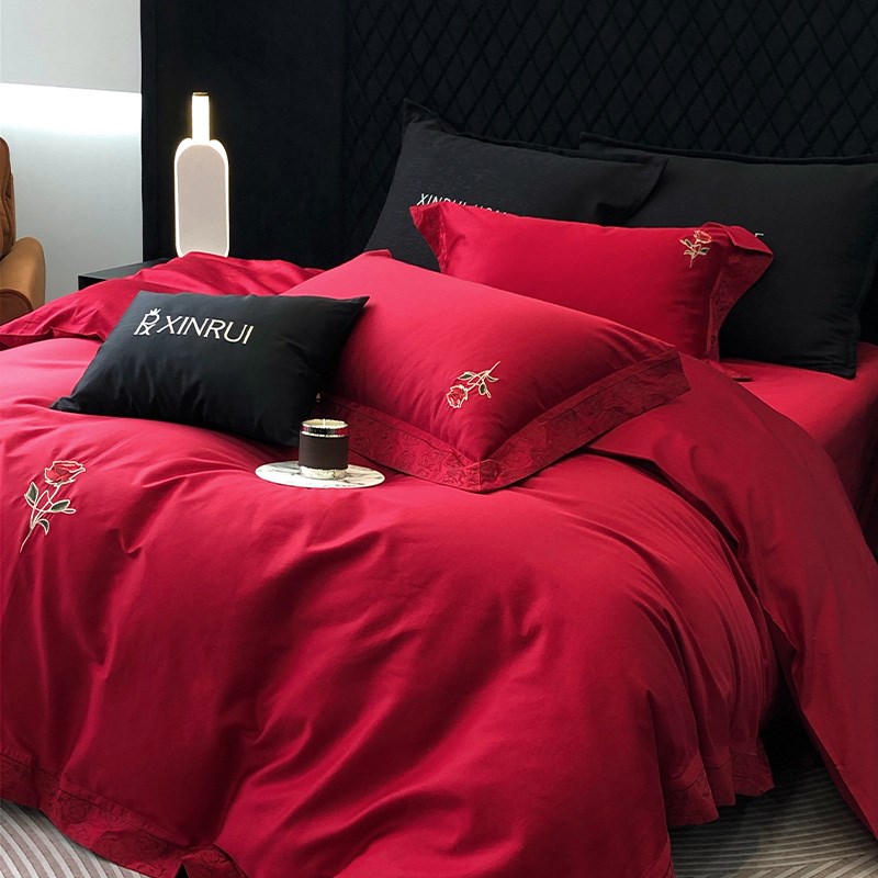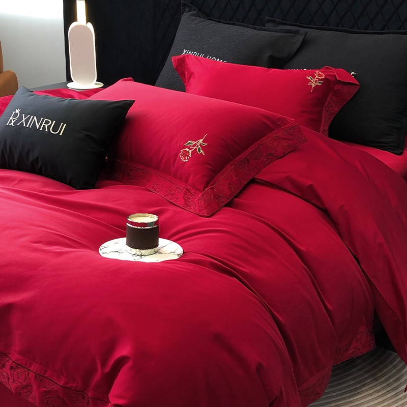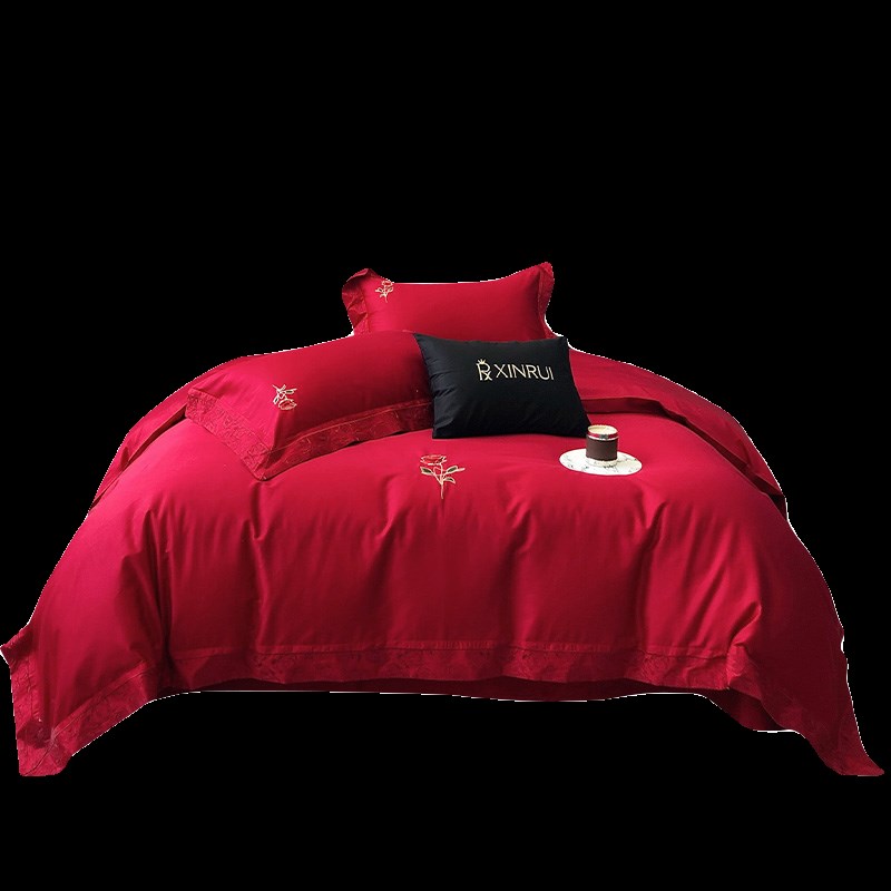 罗兰禧约全棉大红色刺绣结婚四件套100S纯色被套床单床上用品