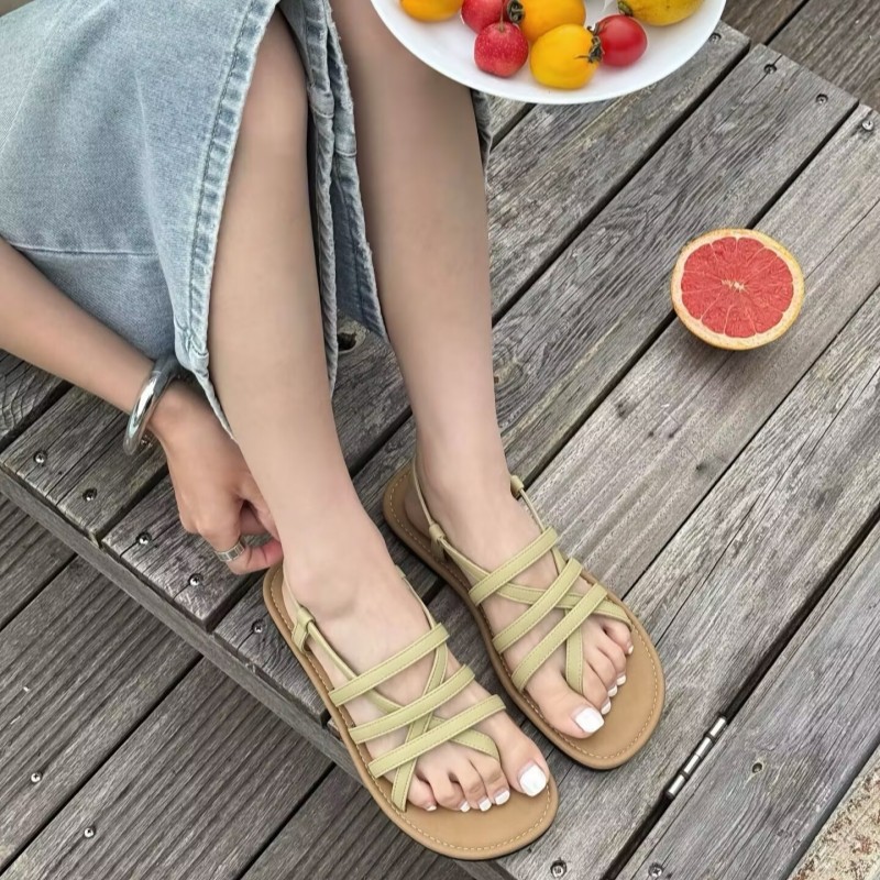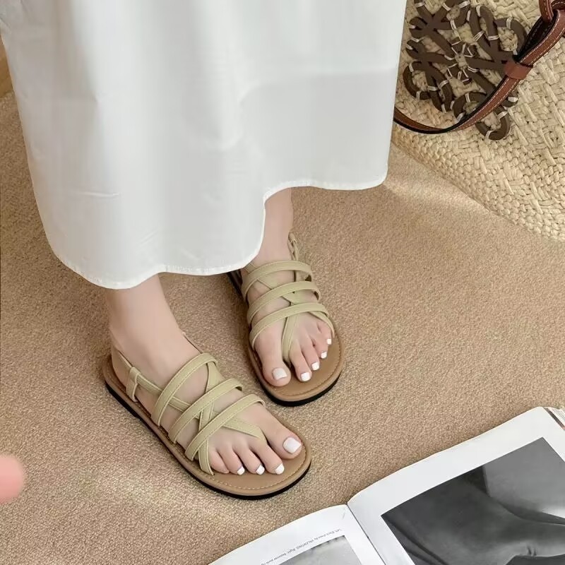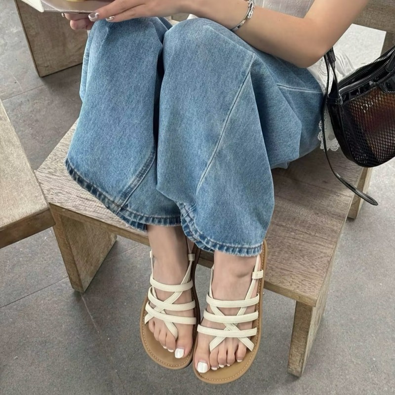 真皮!商场撤柜断码时髦平底夹趾凉鞋女交叉带舒适休闲Z38756-23