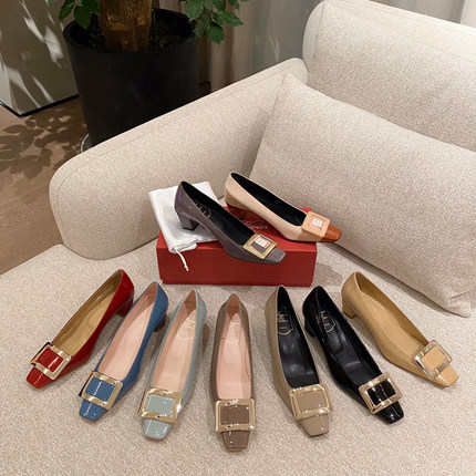 rv方扣粗跟单鞋女浅口舒适高跟鞋