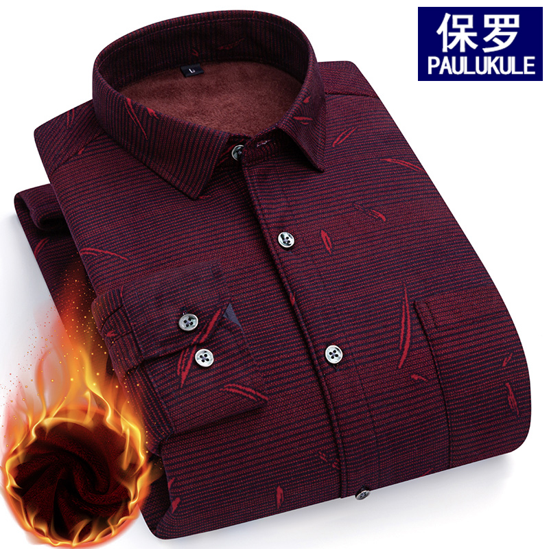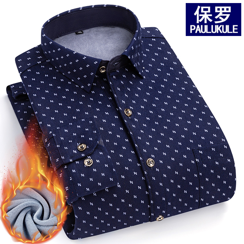 保罗秋冬保暖衬衫加绒加厚印花中老年男肥大码一体绒防寒爸爸衬衣