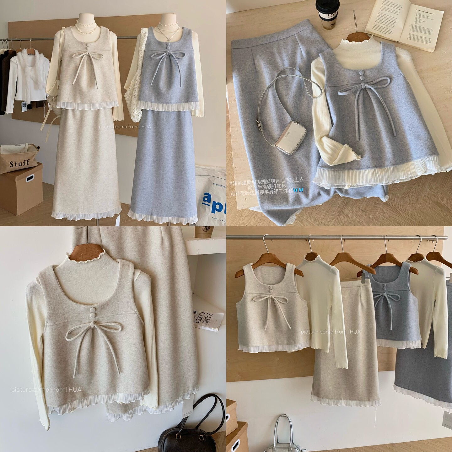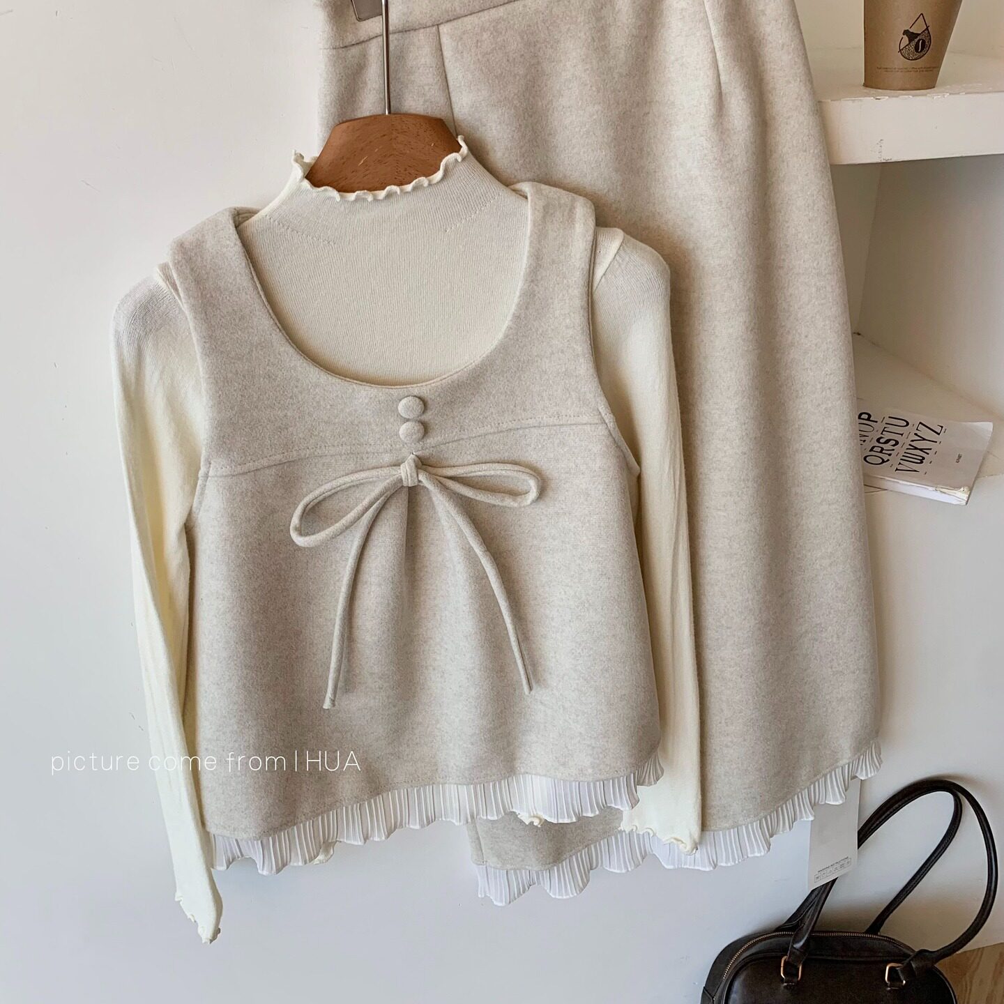 2025冬季新款蝴蝶结毛呢马甲背心+打底衫+百褶花边半身裙三件套女