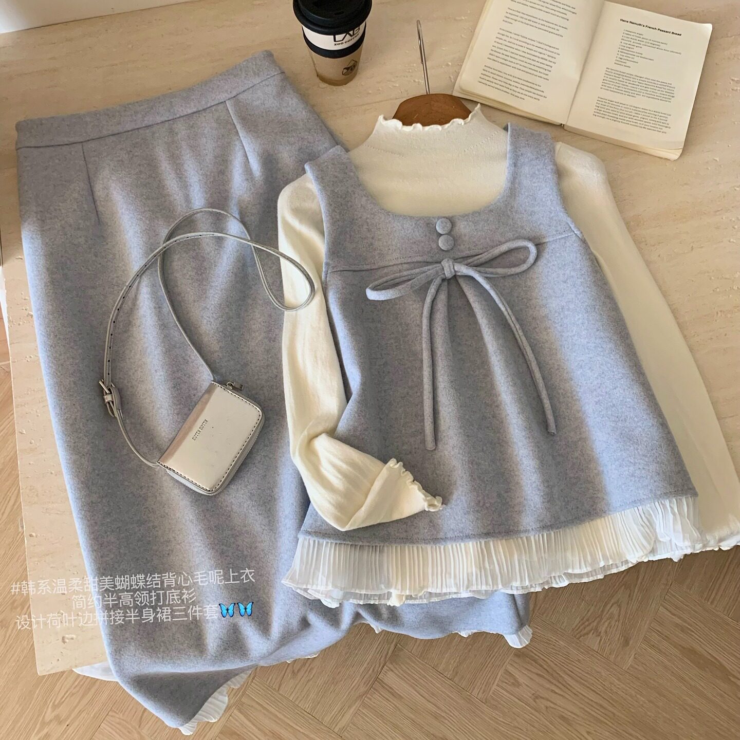 2025冬季蝴蝶结毛呢三件套女装