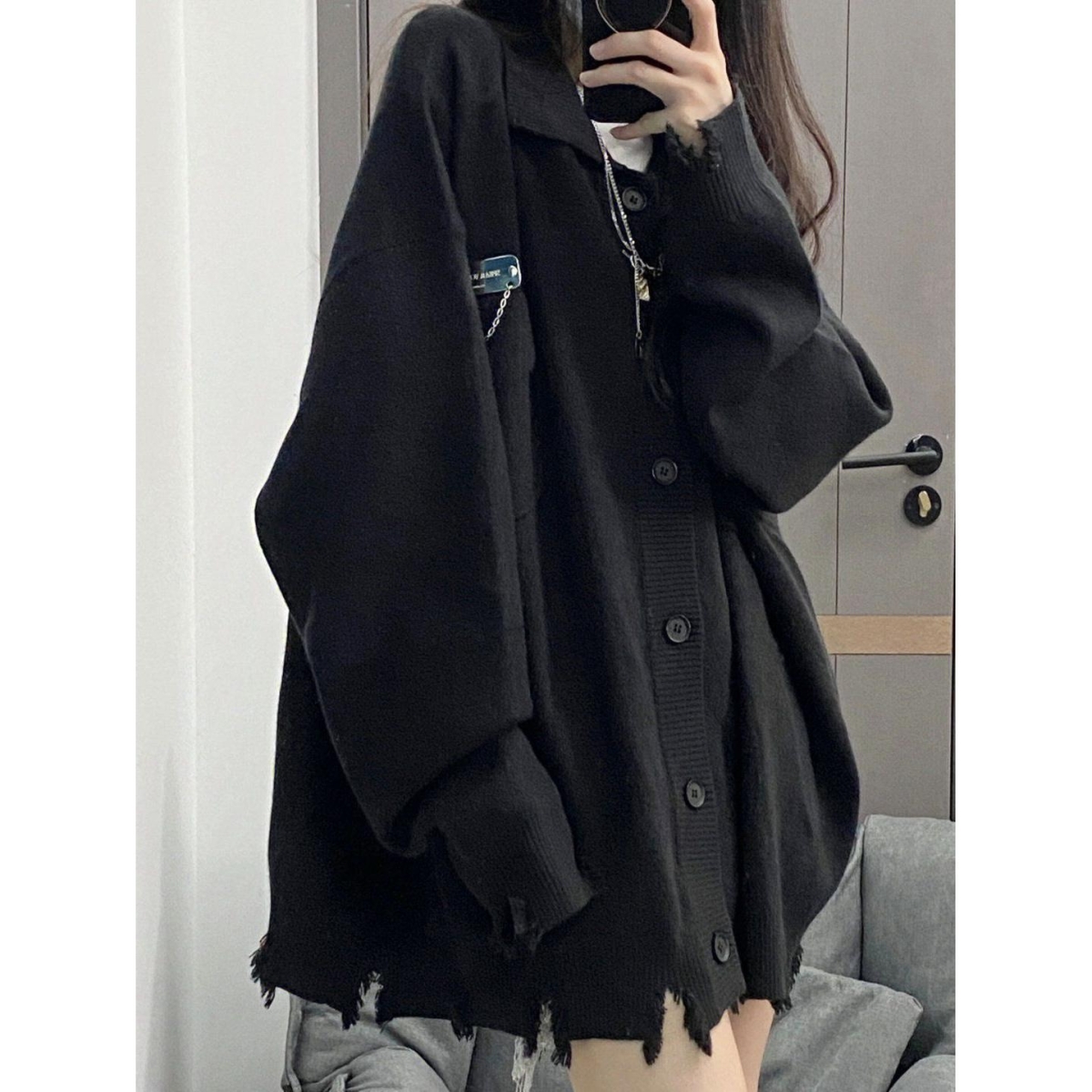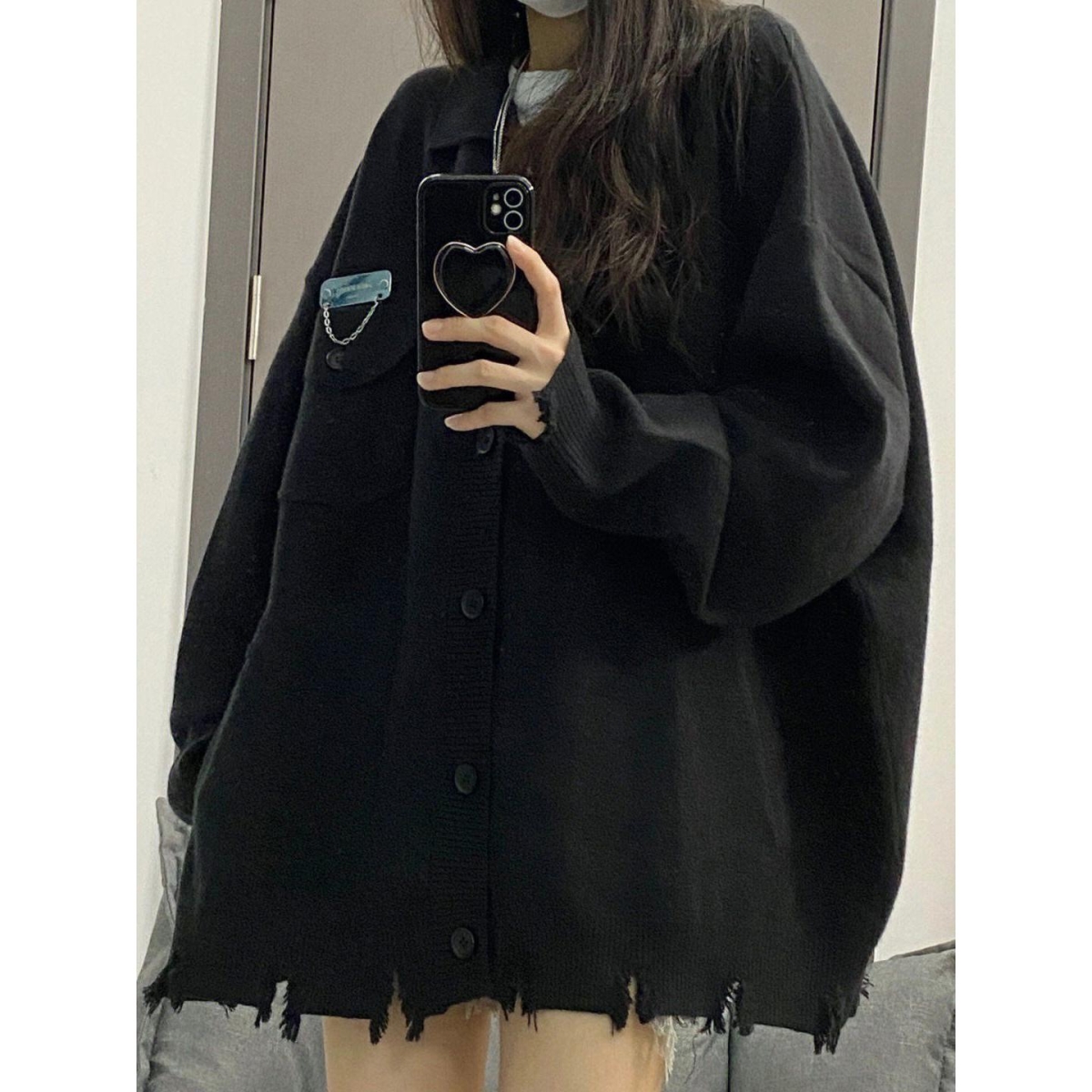 韩系破洞不规则中长款黑色开衫毛衣女学生秋冬新款宽松针织衫外套