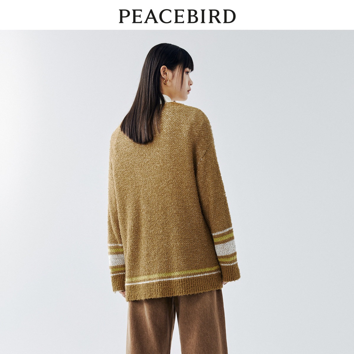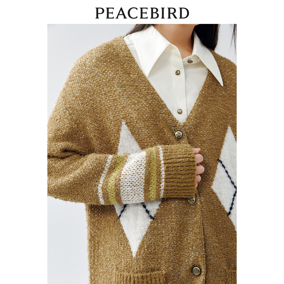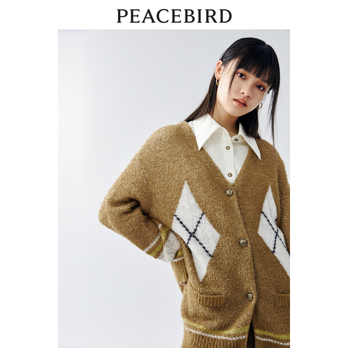 太平鸟中长款菱形格毛衣外套女2024秋装软糯绵羊毛针织开衫奥莱
