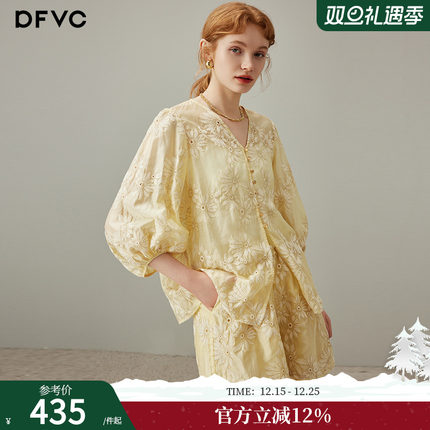 dfvc复古重工绣花衬衫套装女2025夏季新款V领小衫阔腿短裤两件套