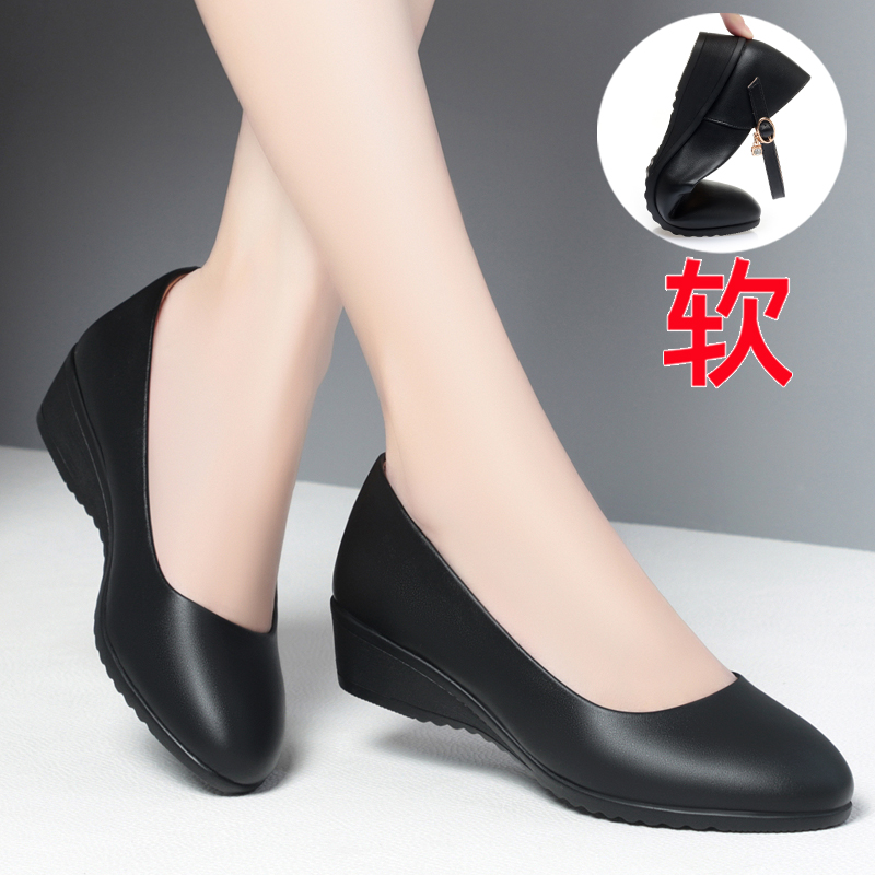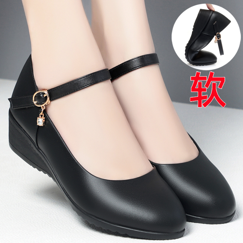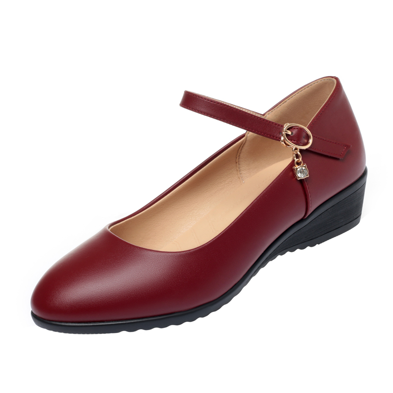 低跟跳舞鞋女真皮舒适工作妈妈鞋圆头一字扣坡跟单鞋中年软底皮鞋