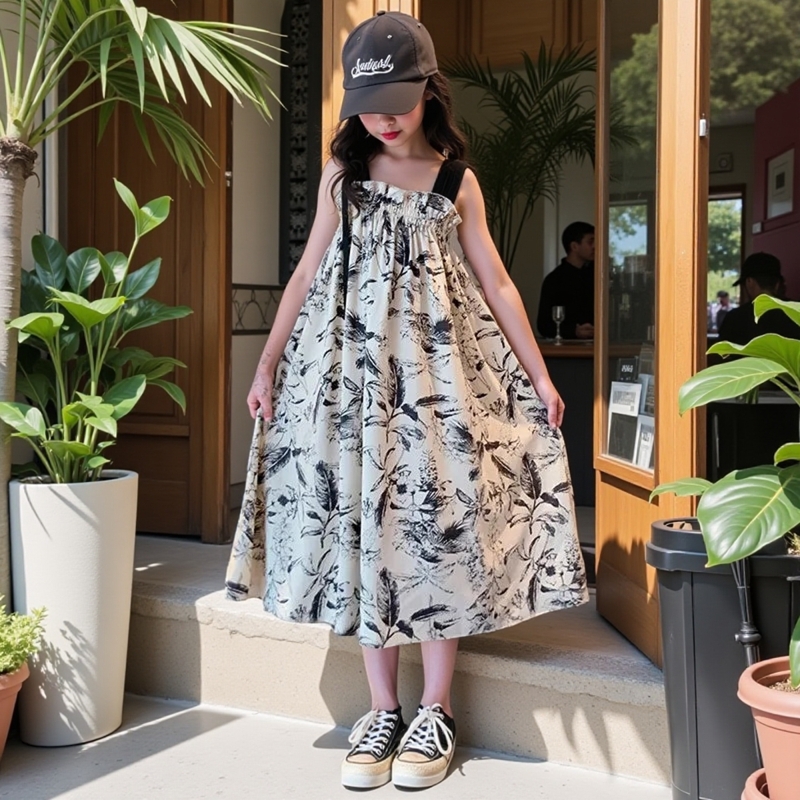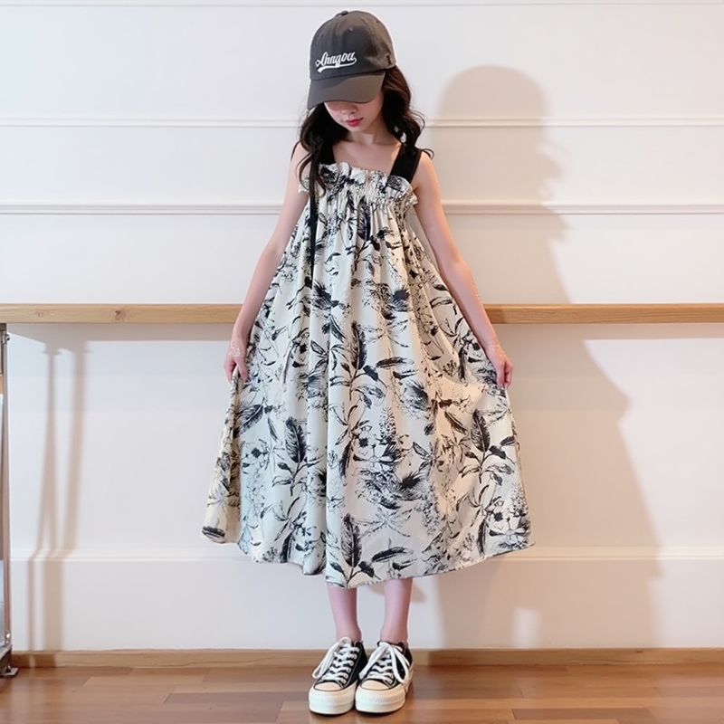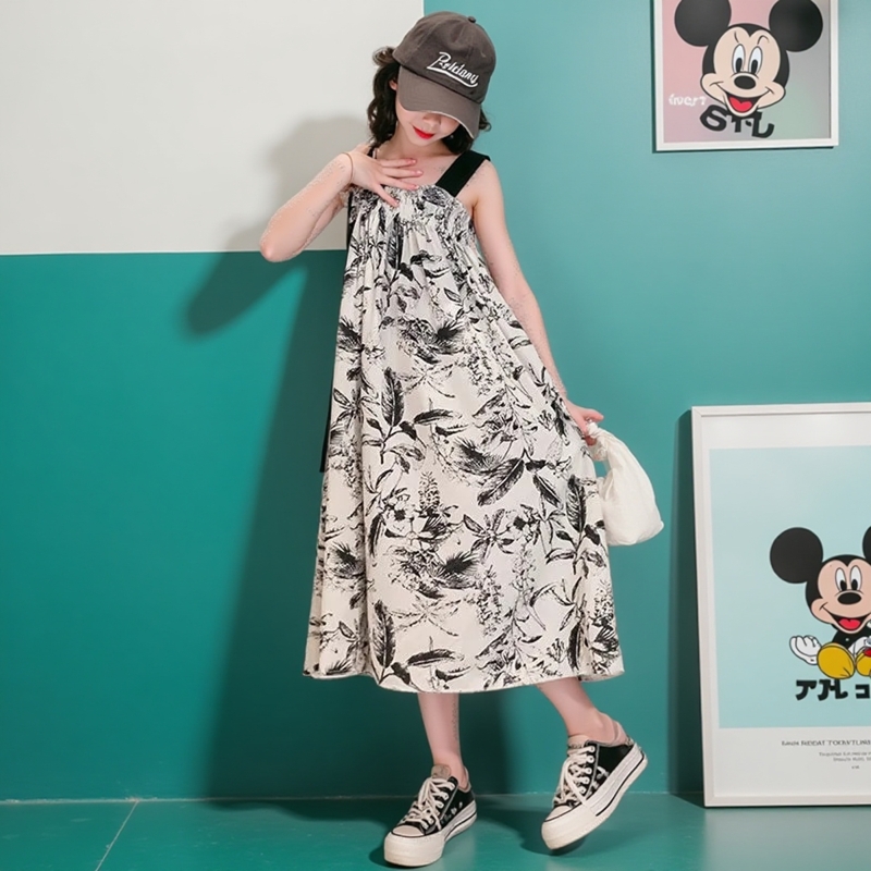 女童夏装连衣裙新款大童洋气水墨画复古网红吊带裙子韩版季末清仓