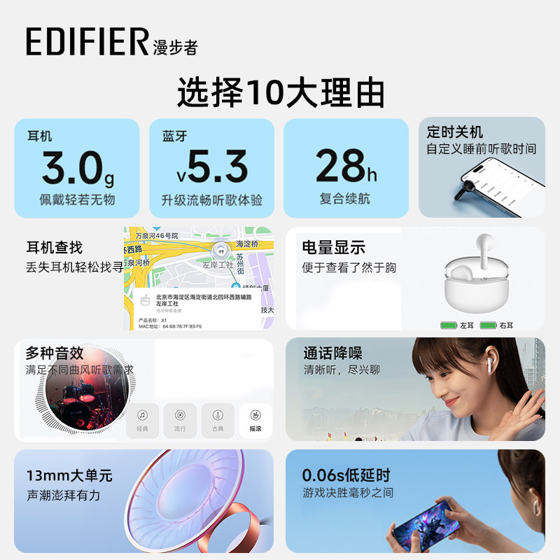 漫步者X1蓝牙耳机真无线半入耳式新款通话降噪运动女生游戏高品质