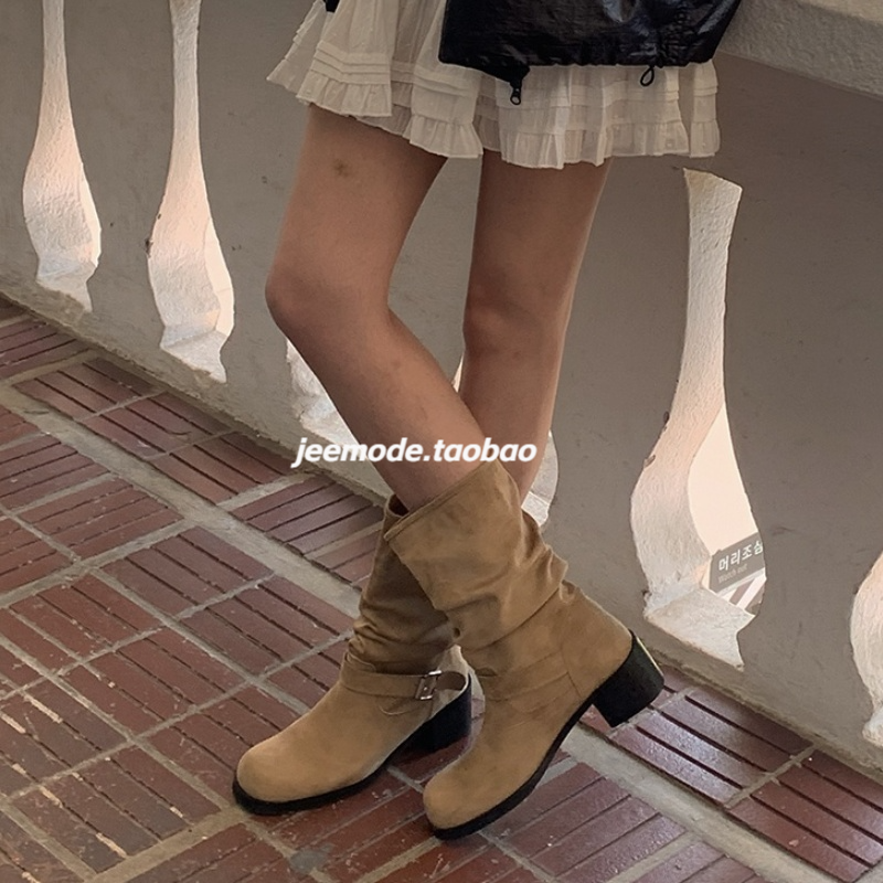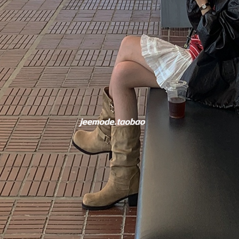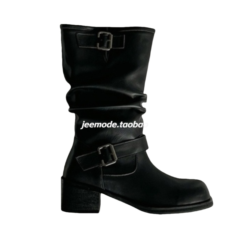 小池在首尔2024年秋季新款中筒皮带金属扣圆头复古粗跟时装靴女