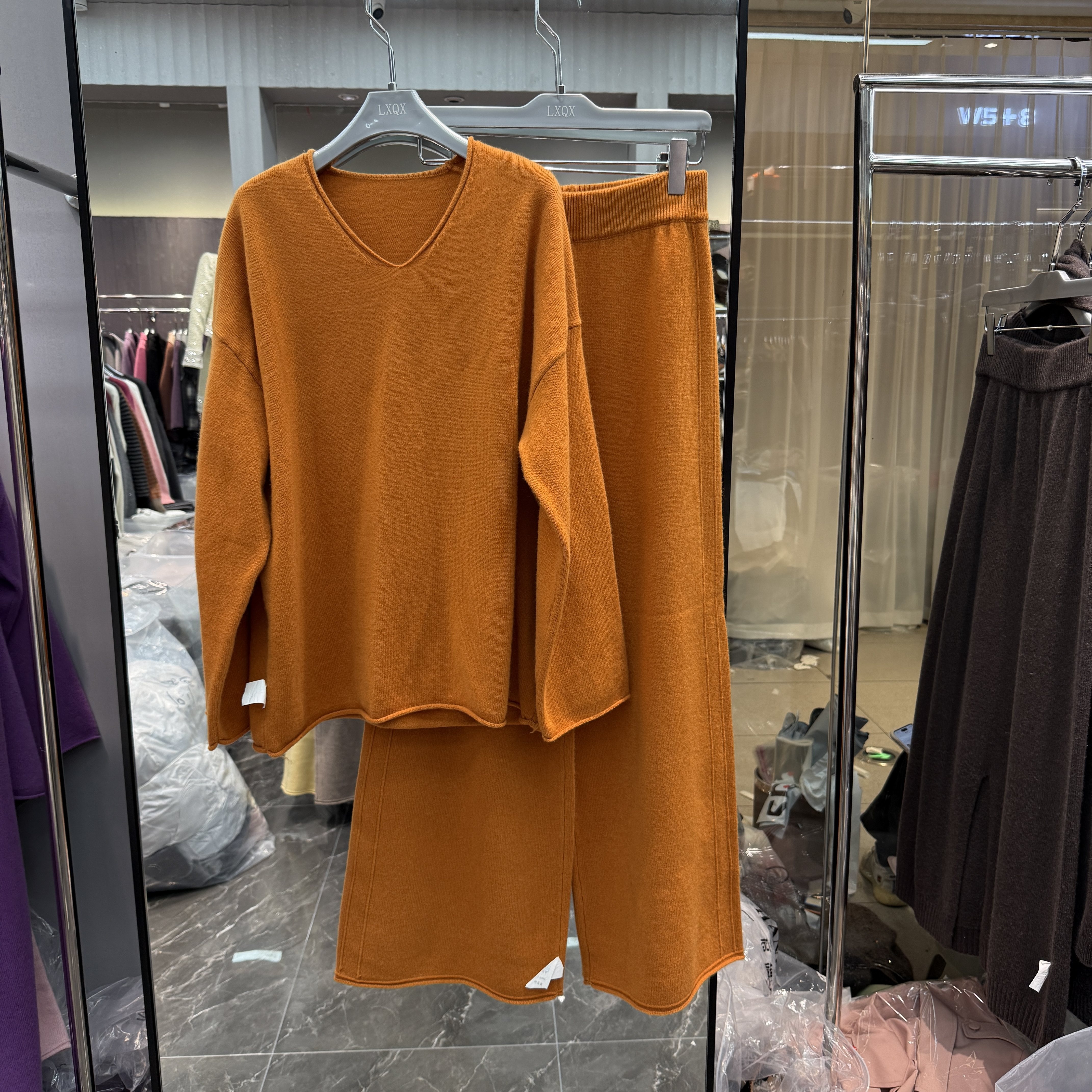 欧洲站2025秋冬新款V领宽松绵羊毛针织上衣+绵羊毛阔腿裤两件套女