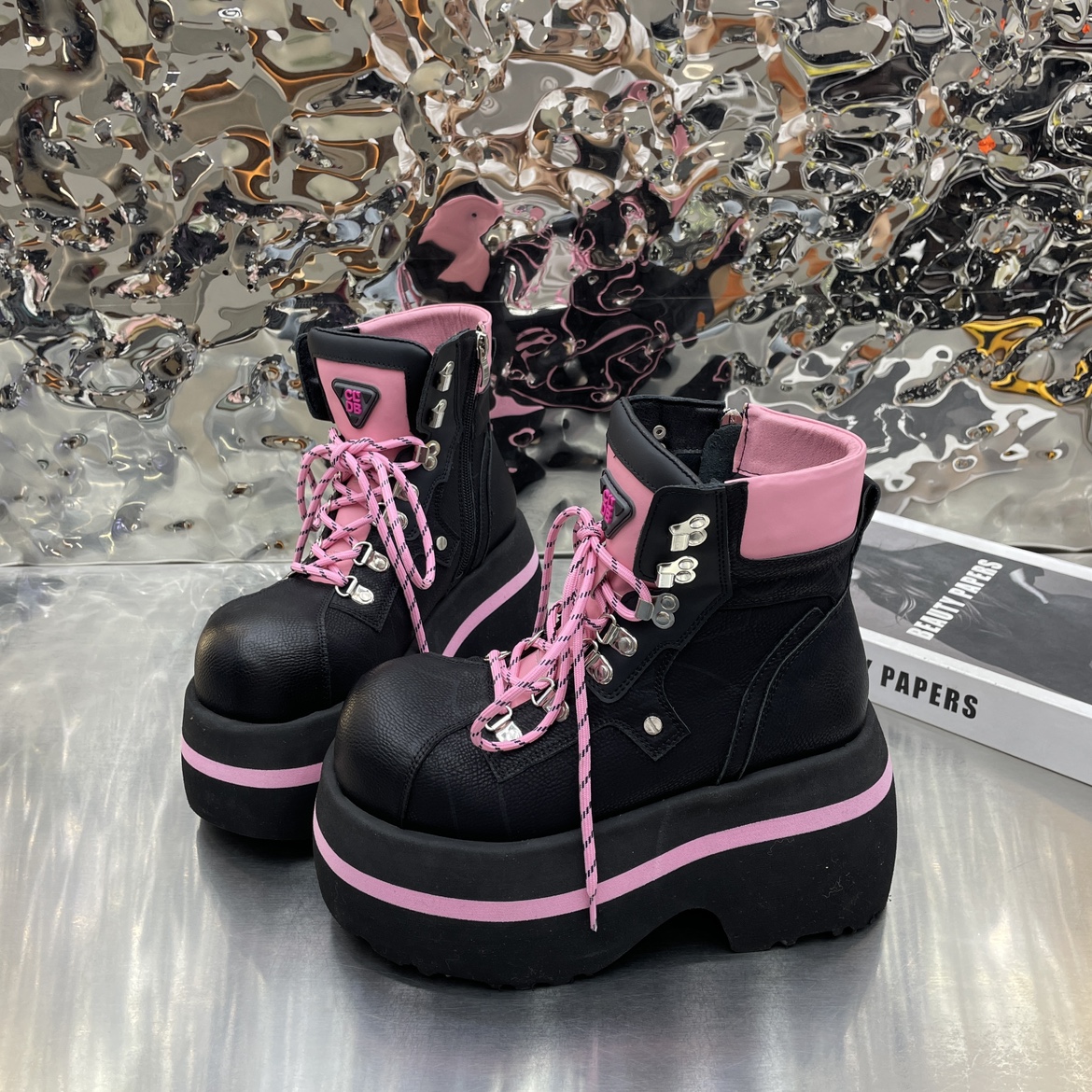 厚底真皮拼色系带休闲工装短筒