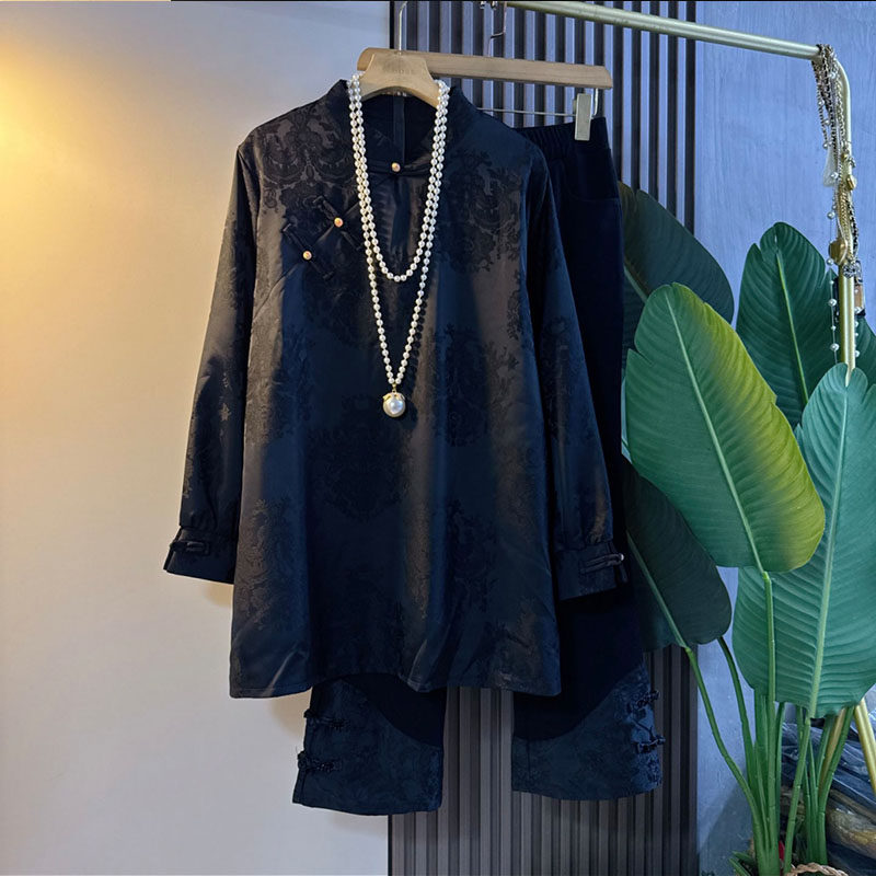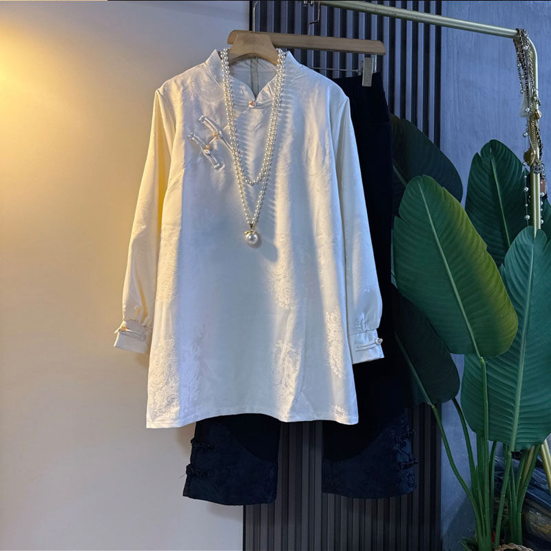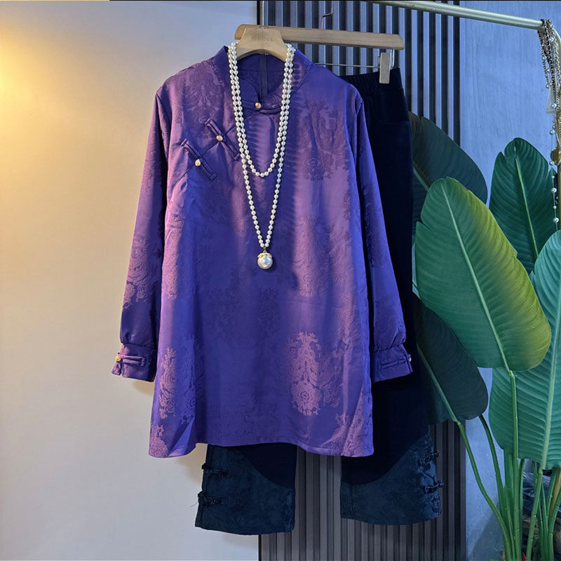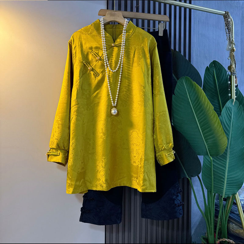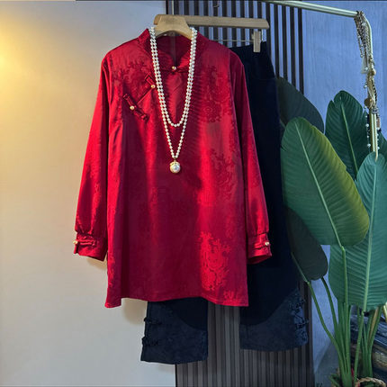 新中式大码女装2025秋冬款国风轻奢锦缎提花盘扣立领韵味长袖衬衫