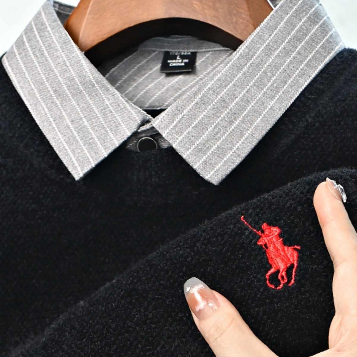 高档一体绒假两件毛衣男士冬季加绒保暖衬衫领针织衫潮流上衣男装