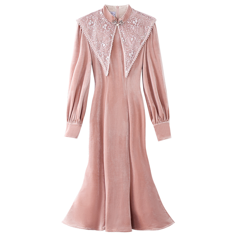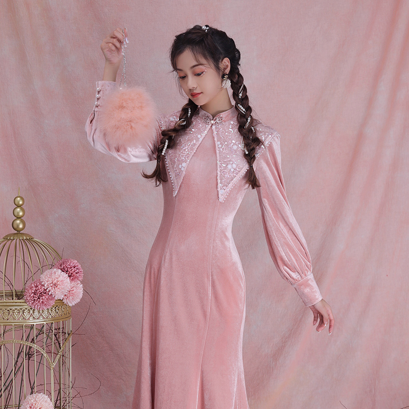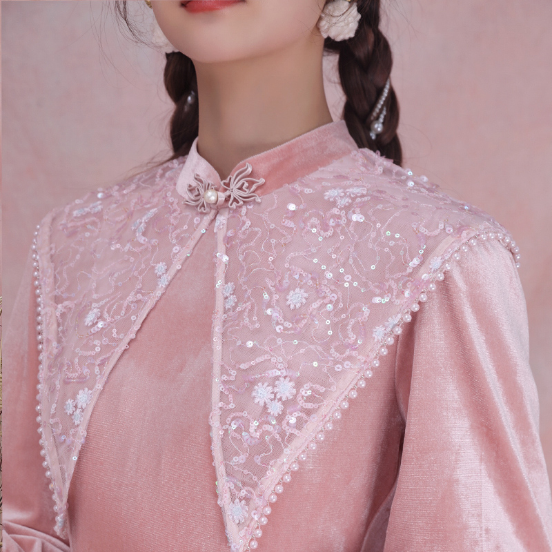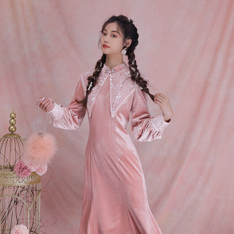 槿爷粉桃酪珠片云肩粉色丝绒修身鱼尾裙名媛改良旗袍版连衣裙秋冬