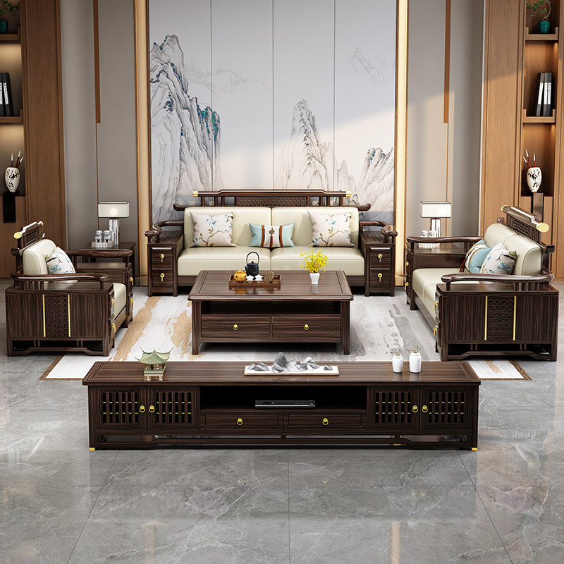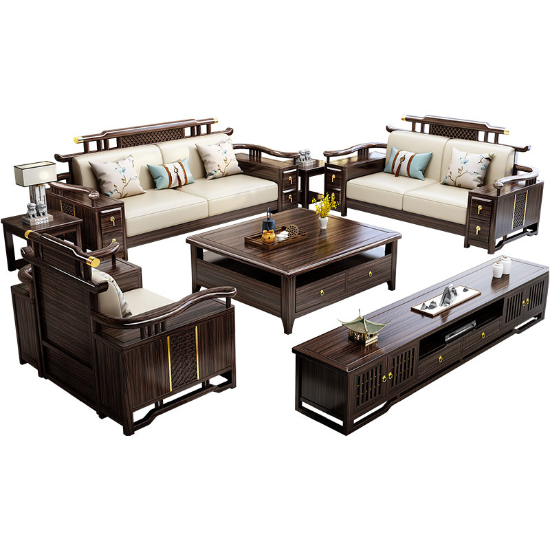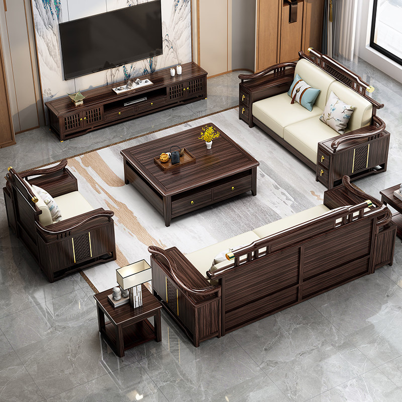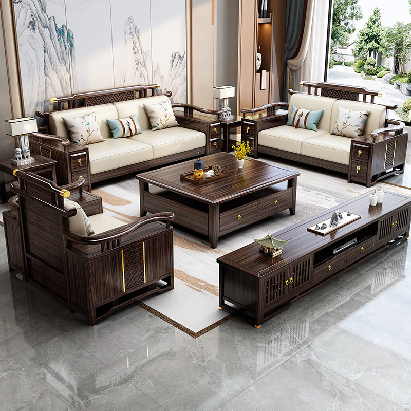 新中式乌金木纳帕真皮实木沙发组合别墅高档客厅冬夏两用木质沙发