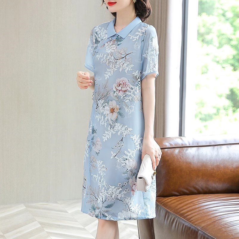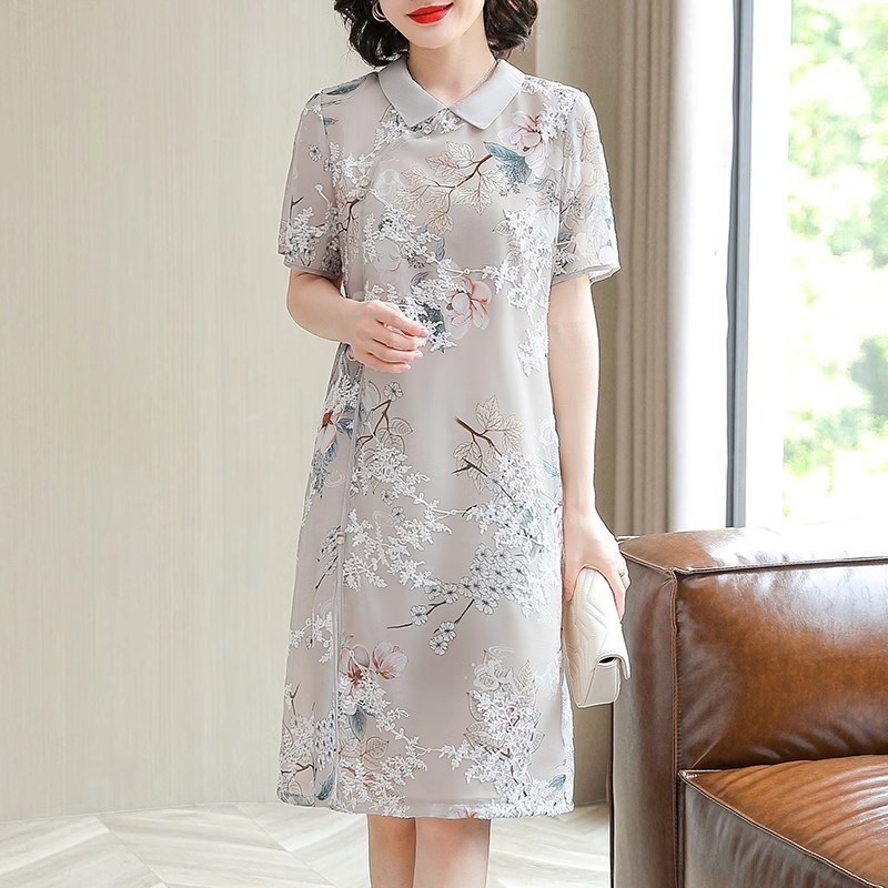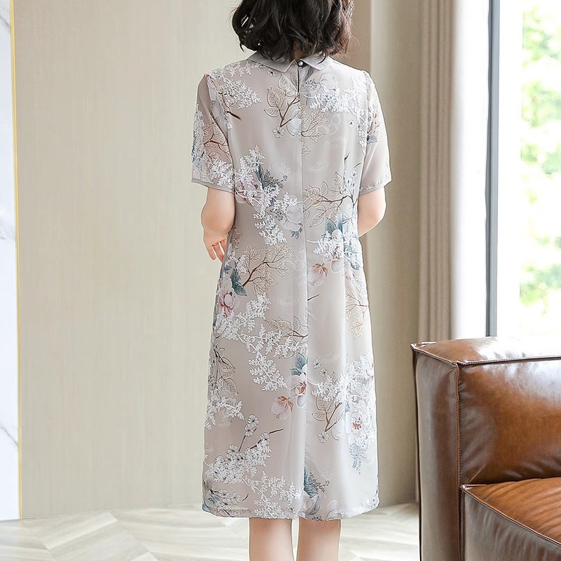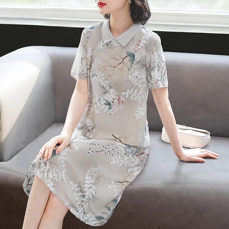 中年妈妈夏装真丝连衣裙2024新款改良旗袍中老年女洋气短袖裙子50