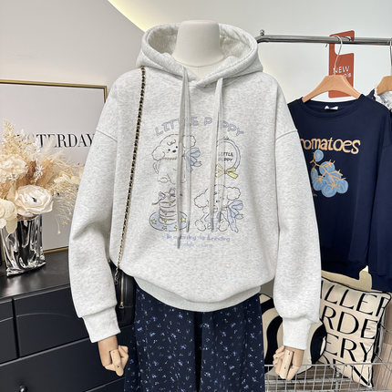 冬季2025新款韩系时尚无感印花珍珠狗狗宽松款连帽卫衣女加绒加厚