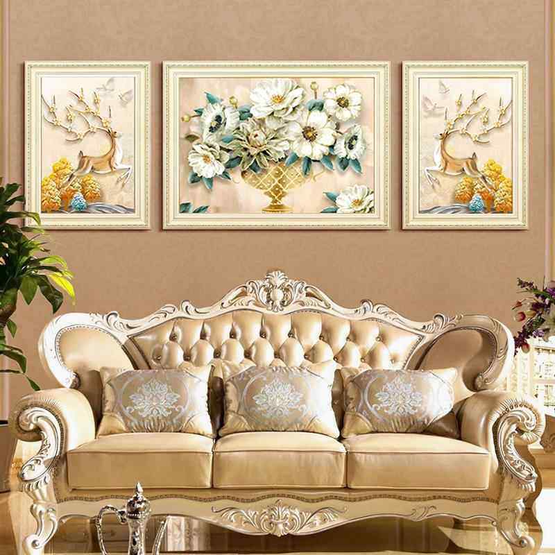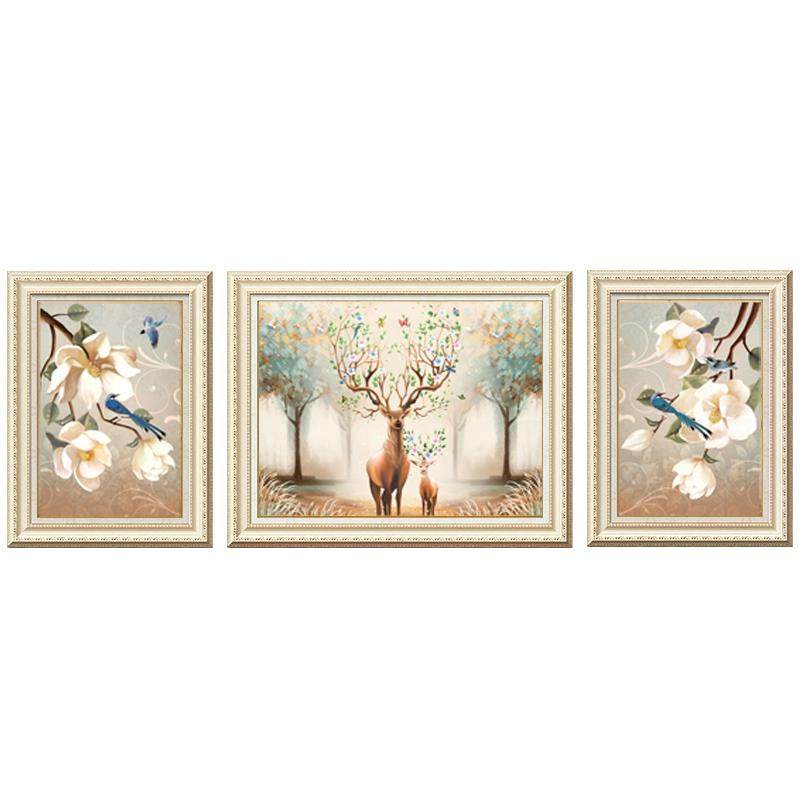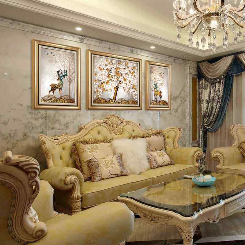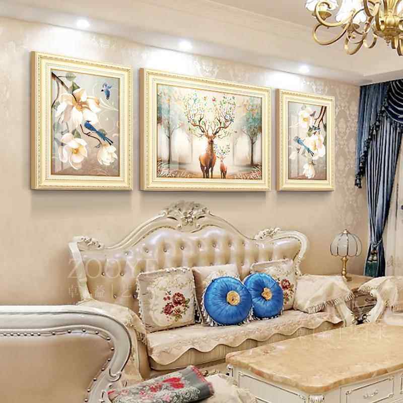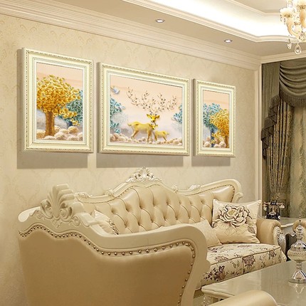 欧式装饰画客厅沙发背景画简欧大气挂画麋鹿墙画玄关有框三联壁画