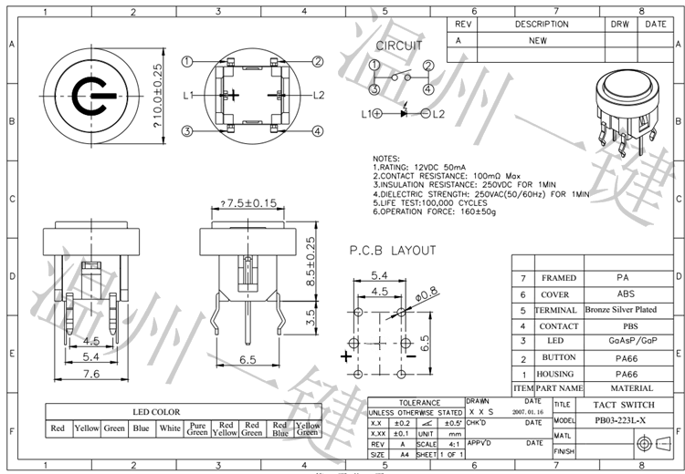 TS-H007 轻触按键开关6*6带灯开关红/绿/蓝灯4脚圆形按钮复位