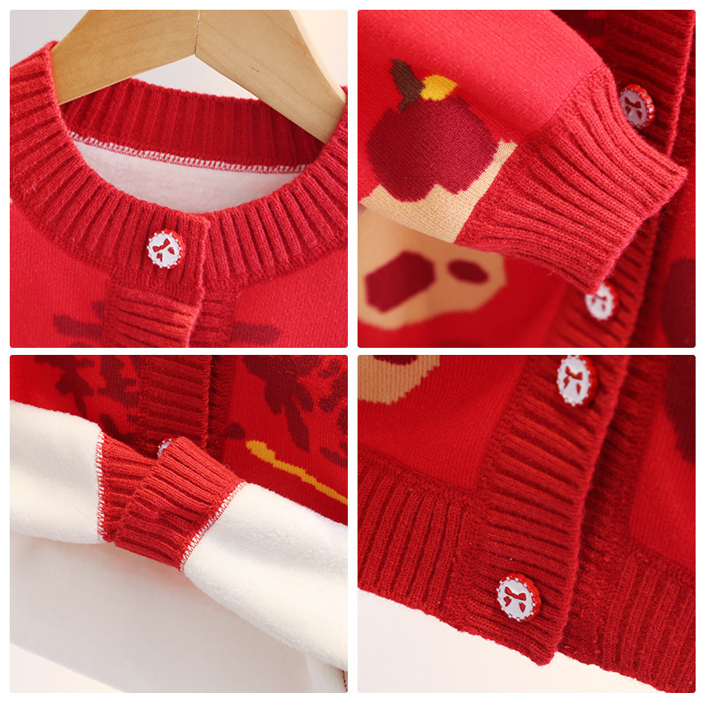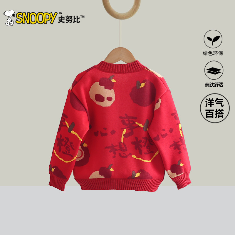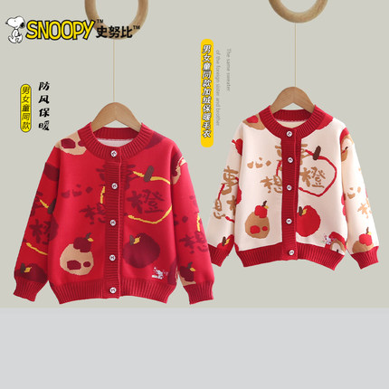 史努比女童秋冬开衫外套2025新款男童春秋红色本命年喜庆针织衫