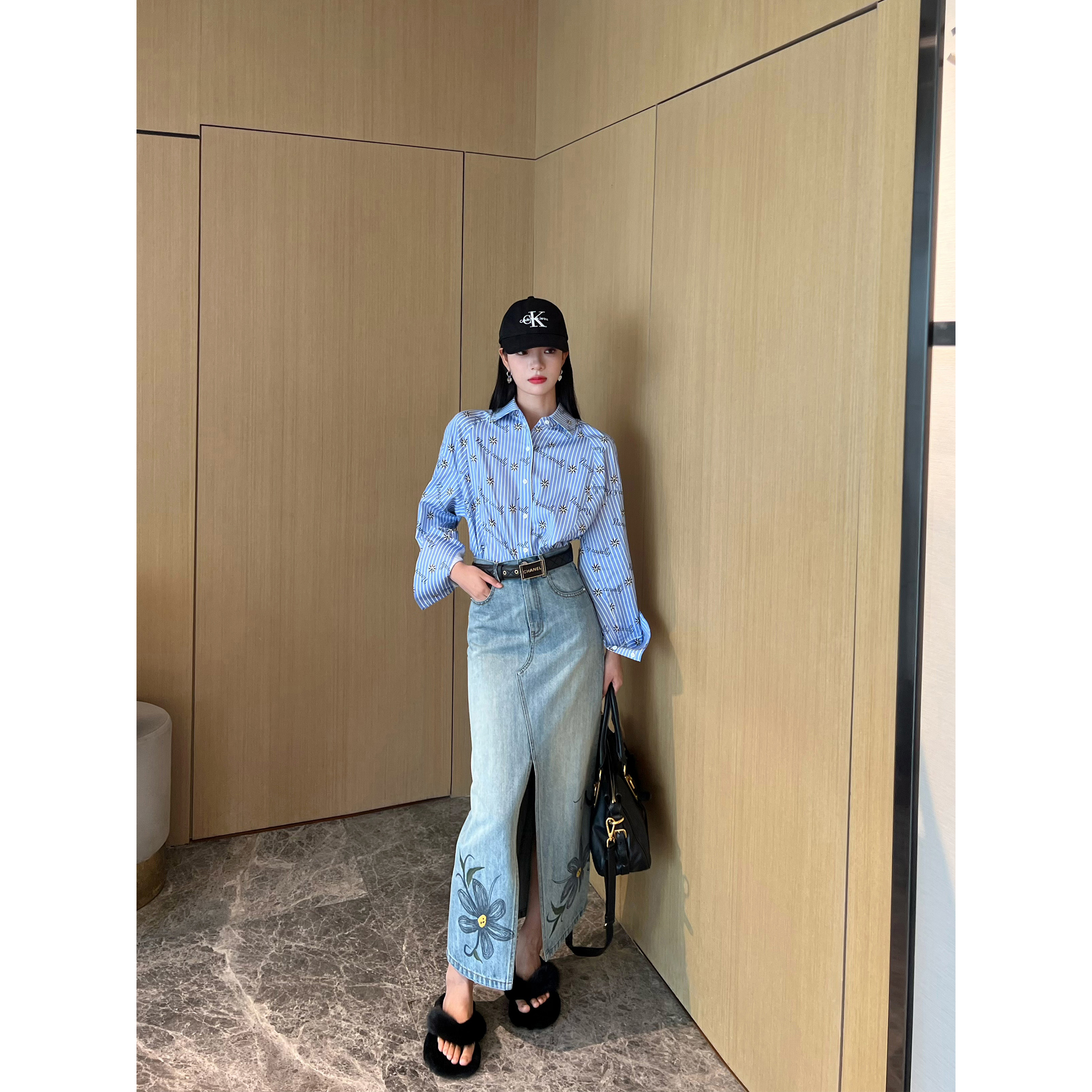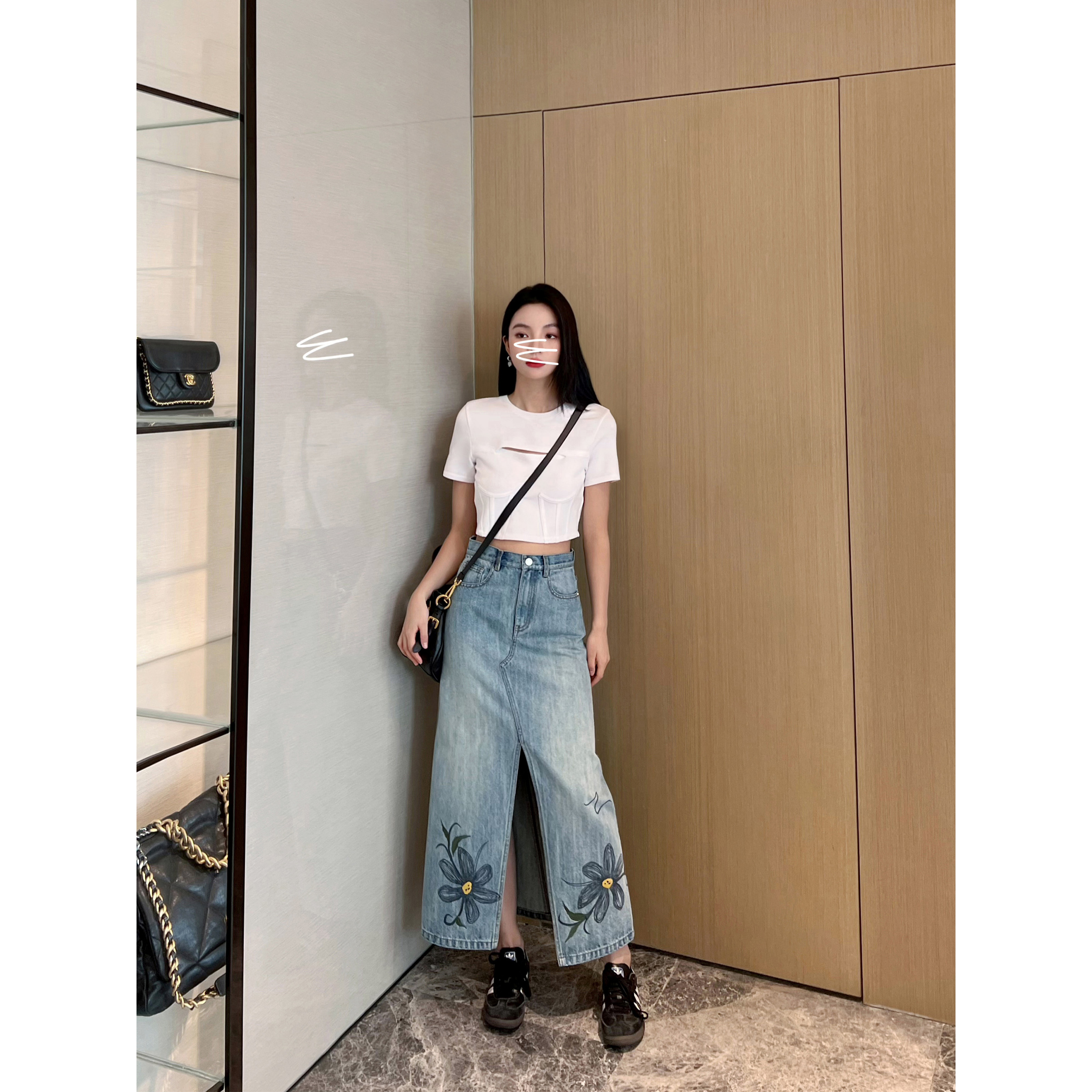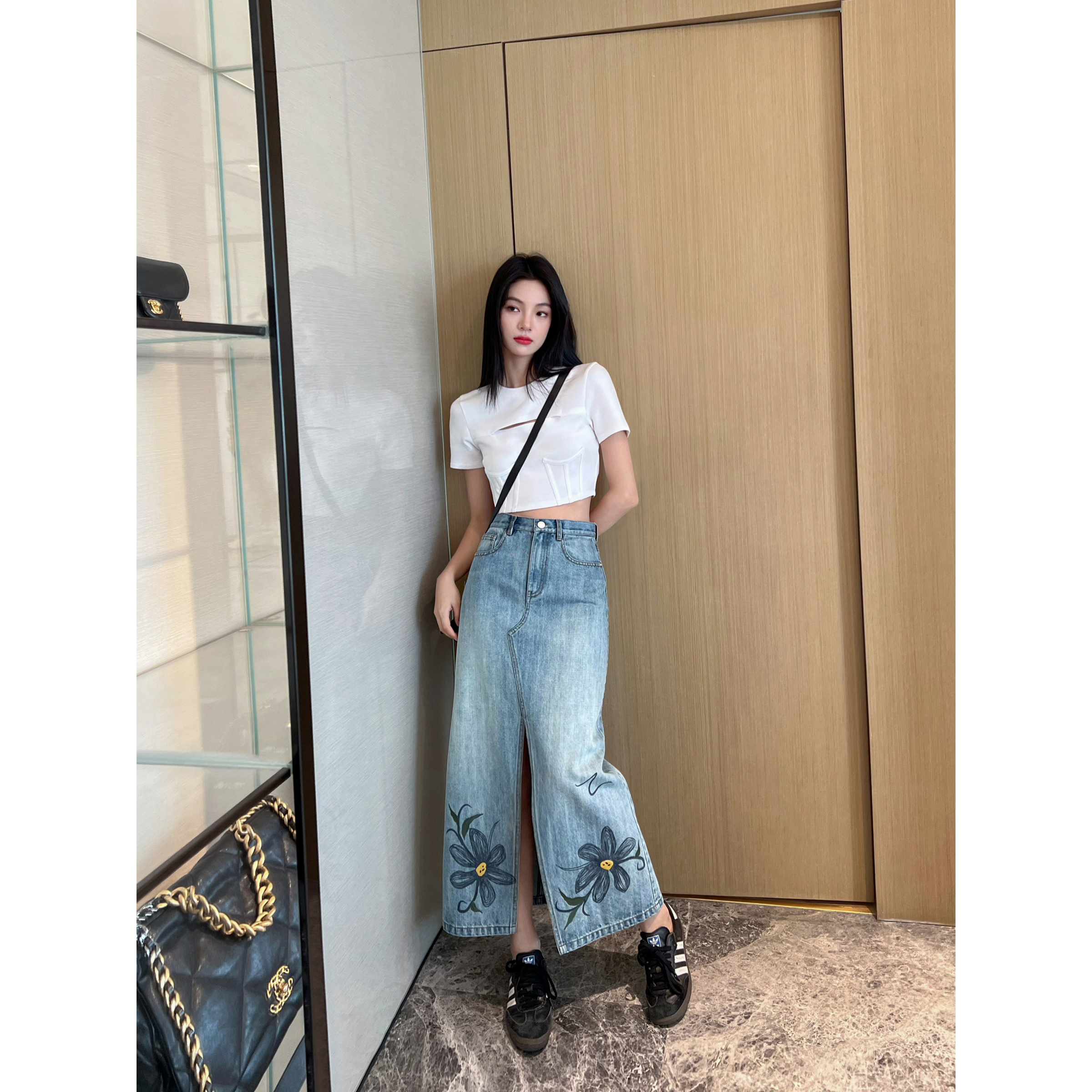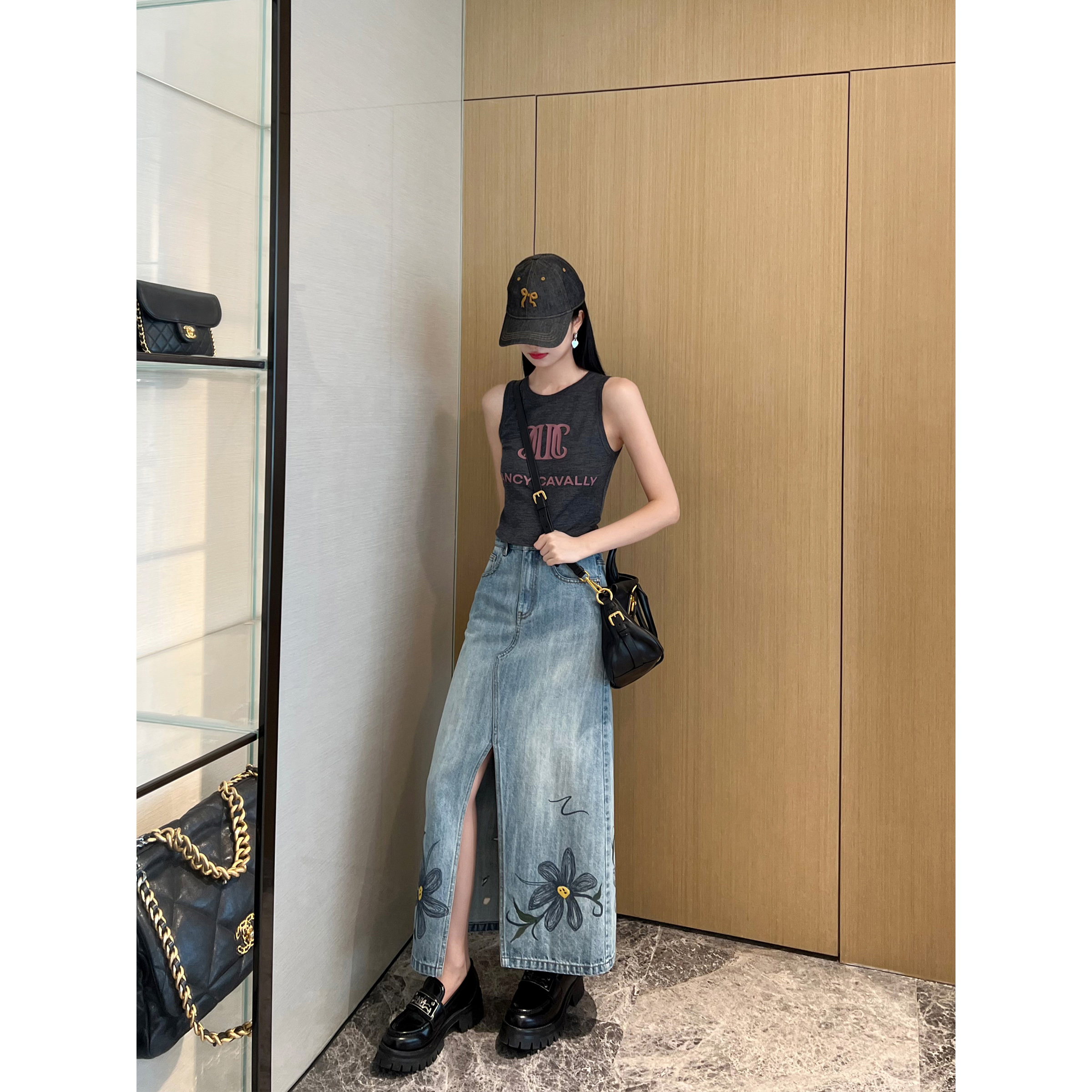 NancyCavally专柜款高端竹节肌理棉 复古印花刺绣开叉牛仔半身裙
