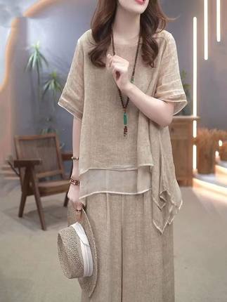 文艺复古天丝棉麻套装女2026夏季新民族风宽松显瘦遮肚气质两件套