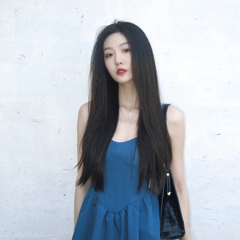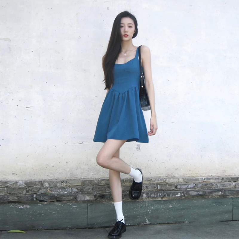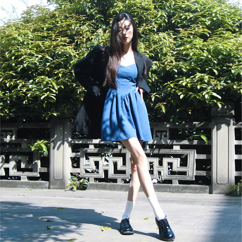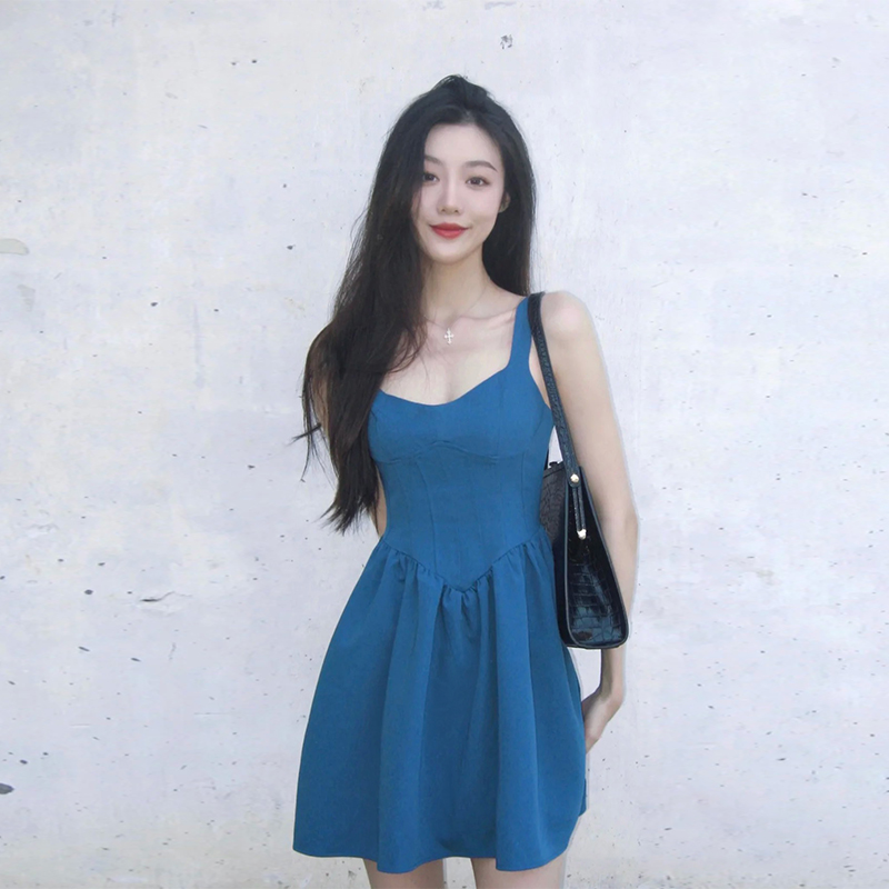 少女感克莱因蓝连衣裙女夏季高级可爱减龄小个子小众鱼骨吊带裙子