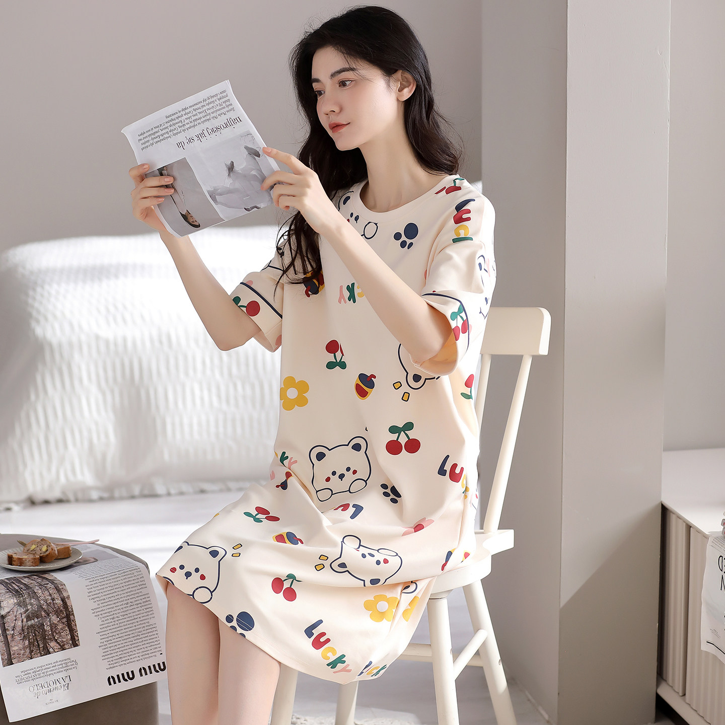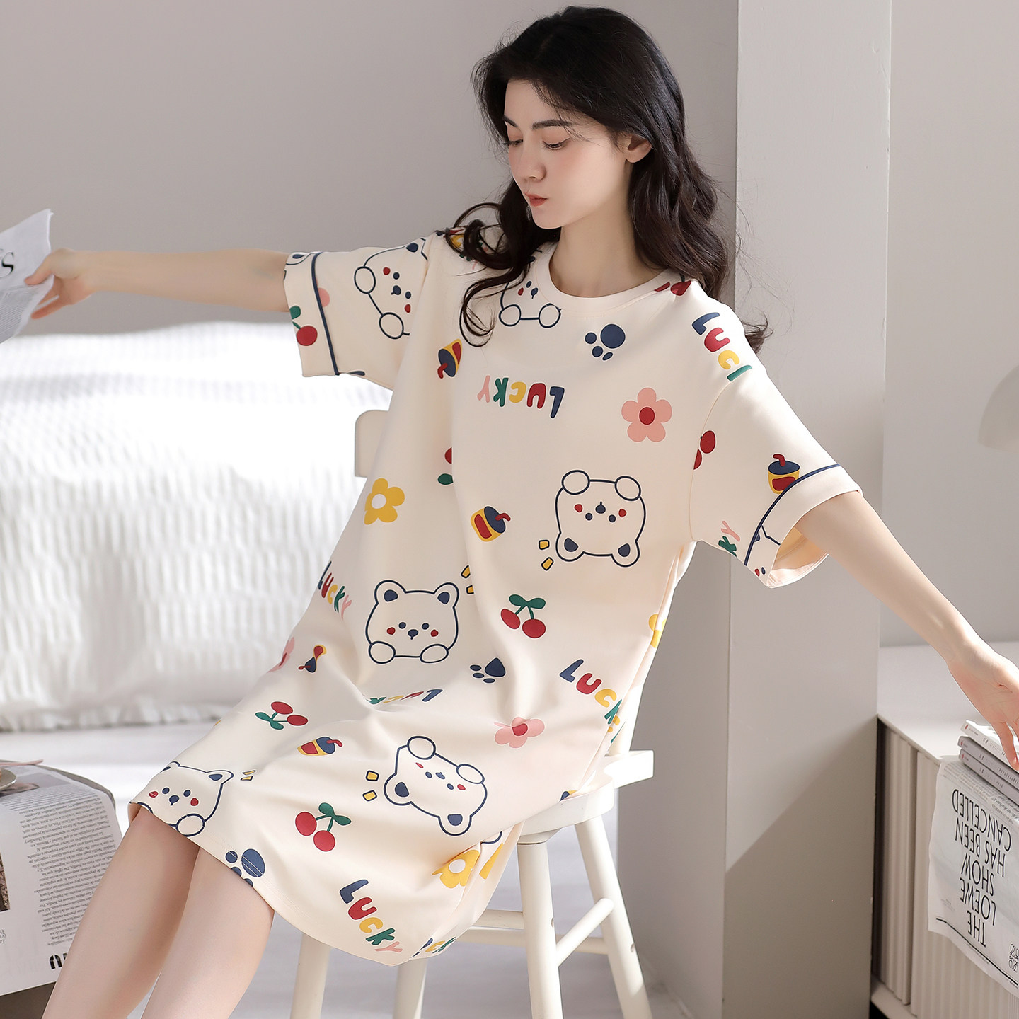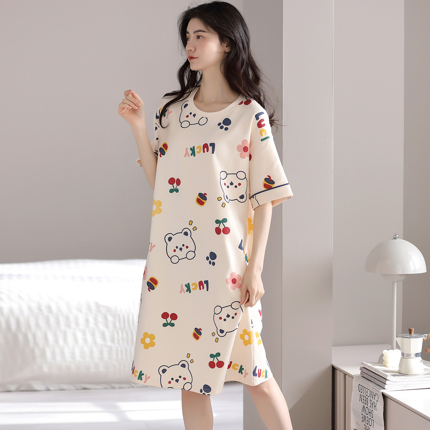 宜而爽圆领短袖中长款睡裙女士夏天全棉薄款卡通印花简约风连衣裙