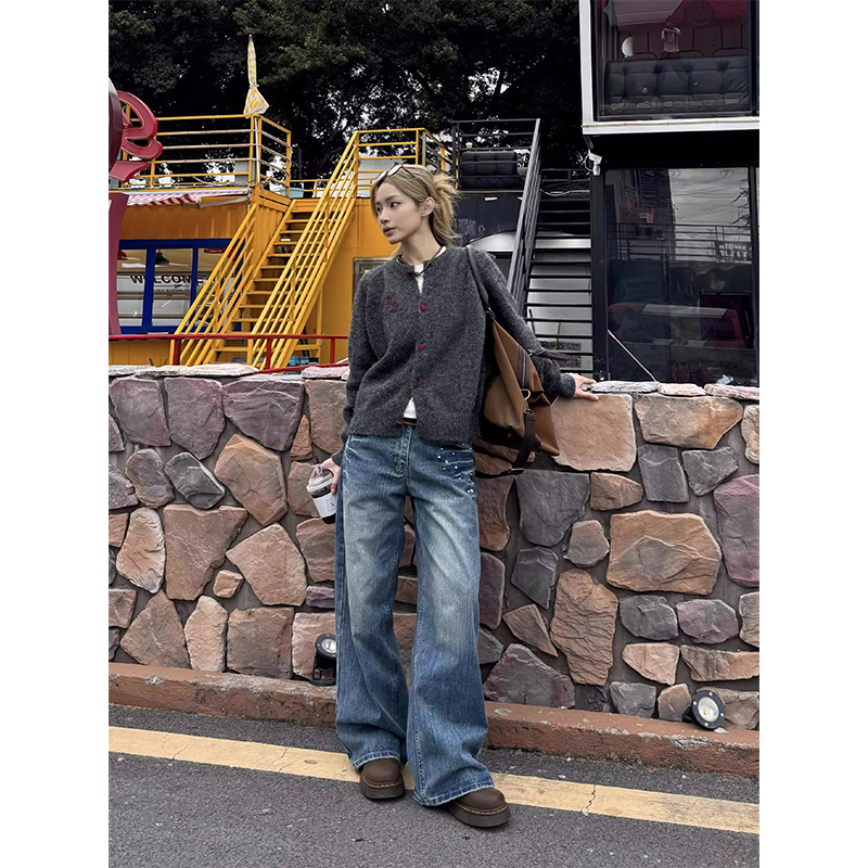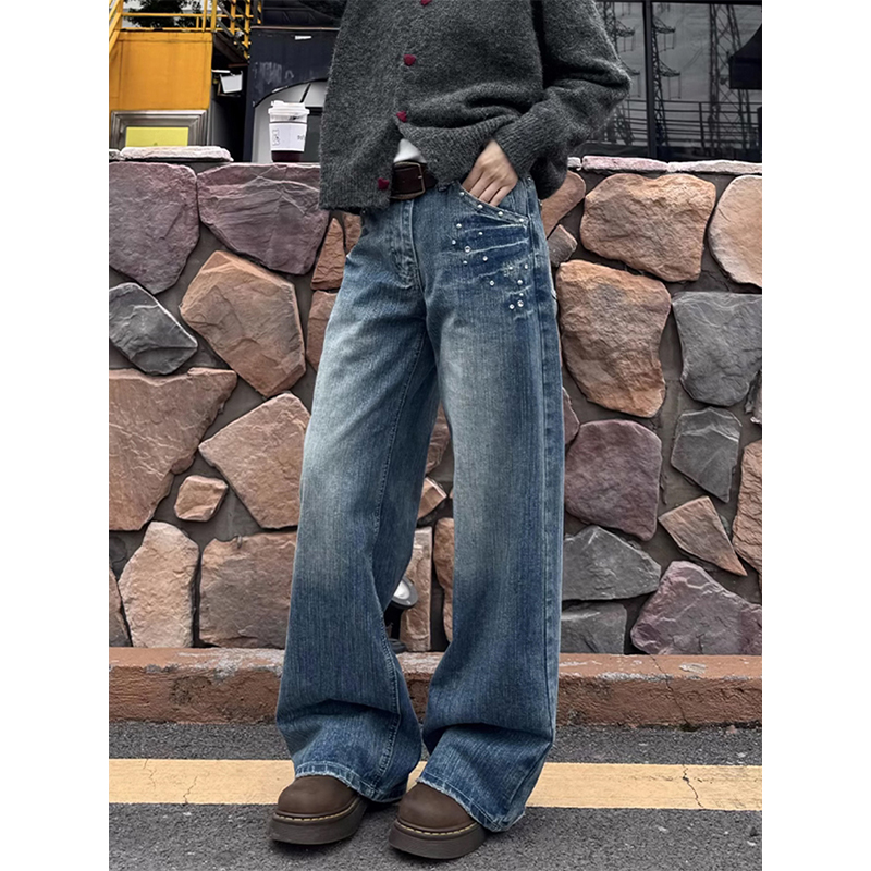 美式复古宽松闪电纹水洗阔腿牛仔裤女2025春秋新款高腰直筒长裤子