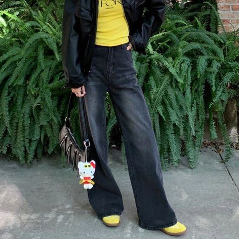 美式复古做旧加绒牛仔裤女2025秋冬季高腰宽松阔腿直筒拖地长裤潮