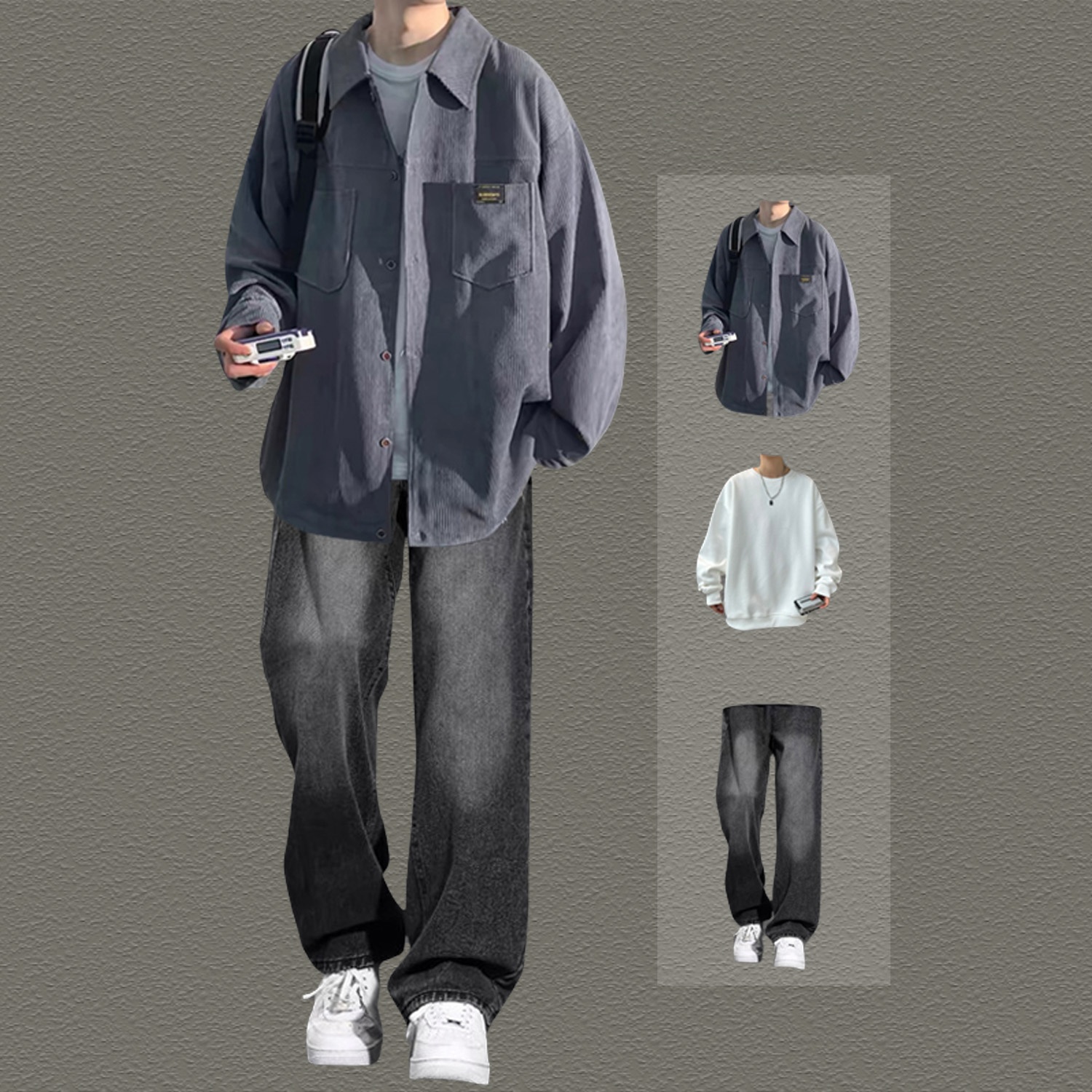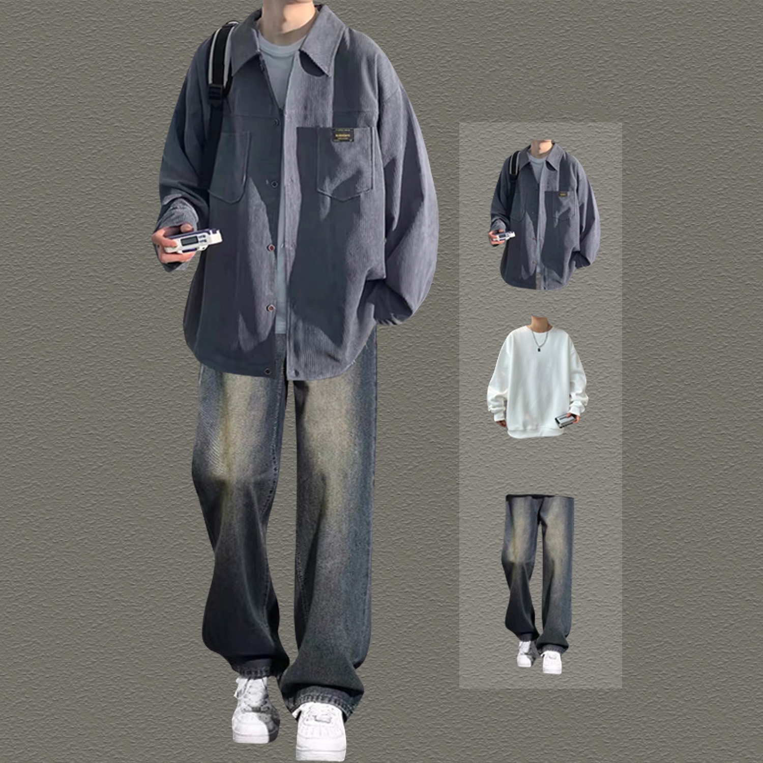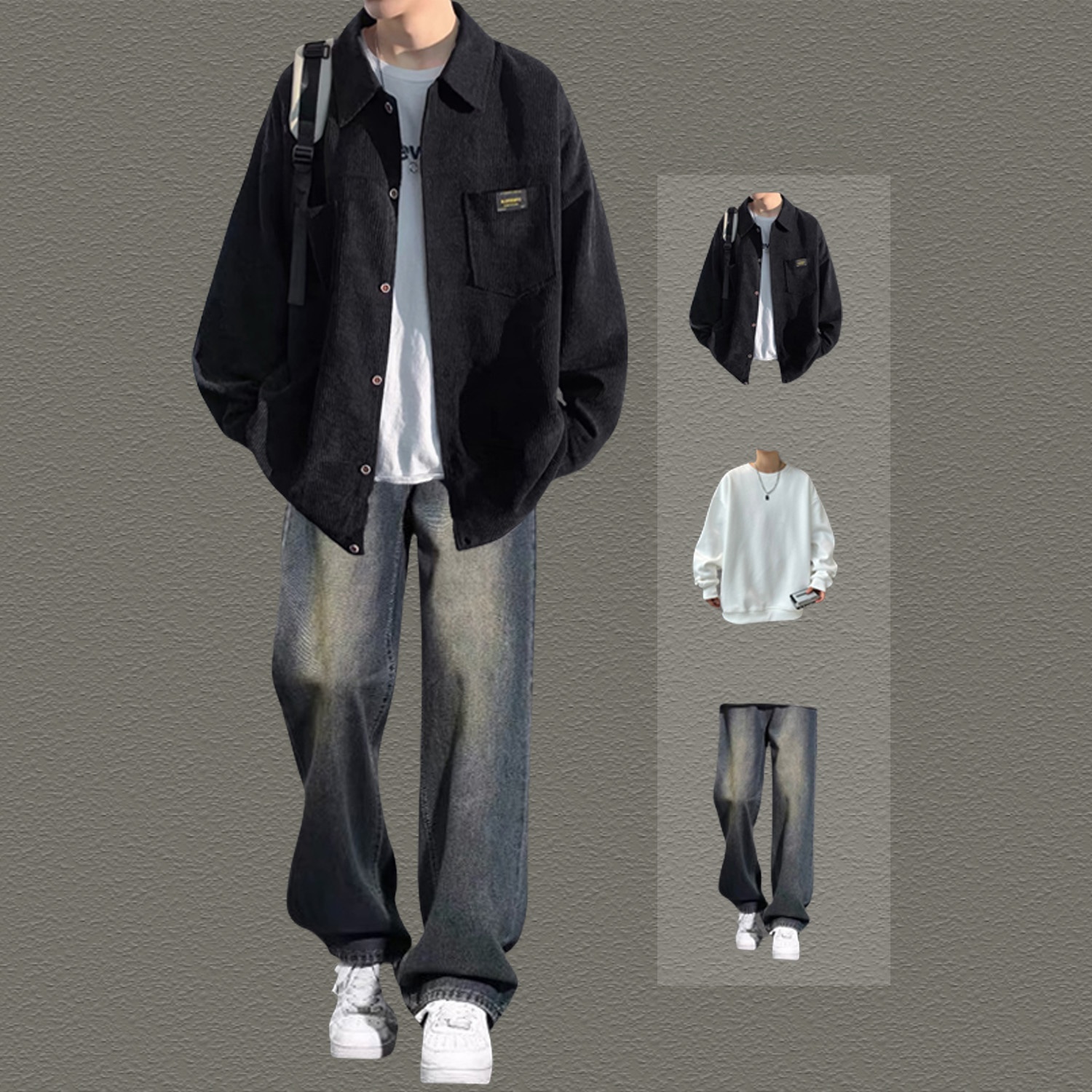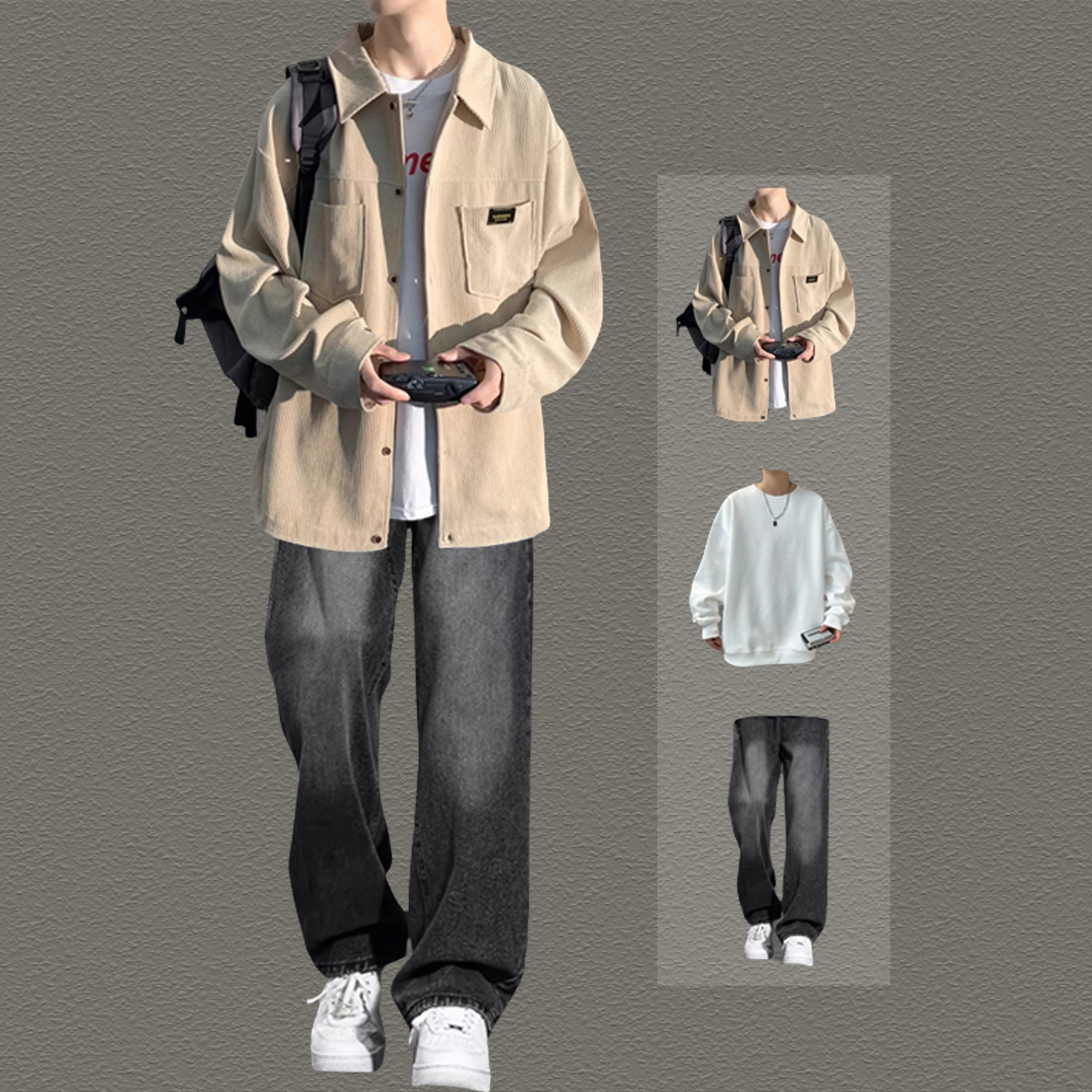 春秋潮流灯芯绒长袖衬衫男生套装痞帅薄款青少年三件套宽松外套