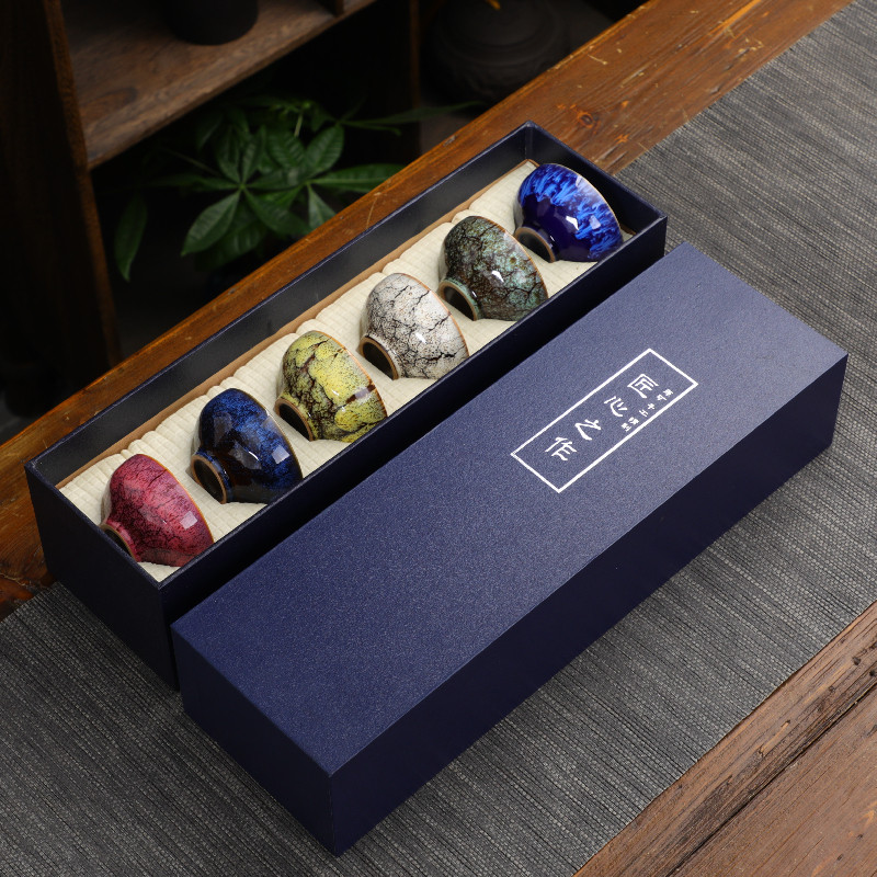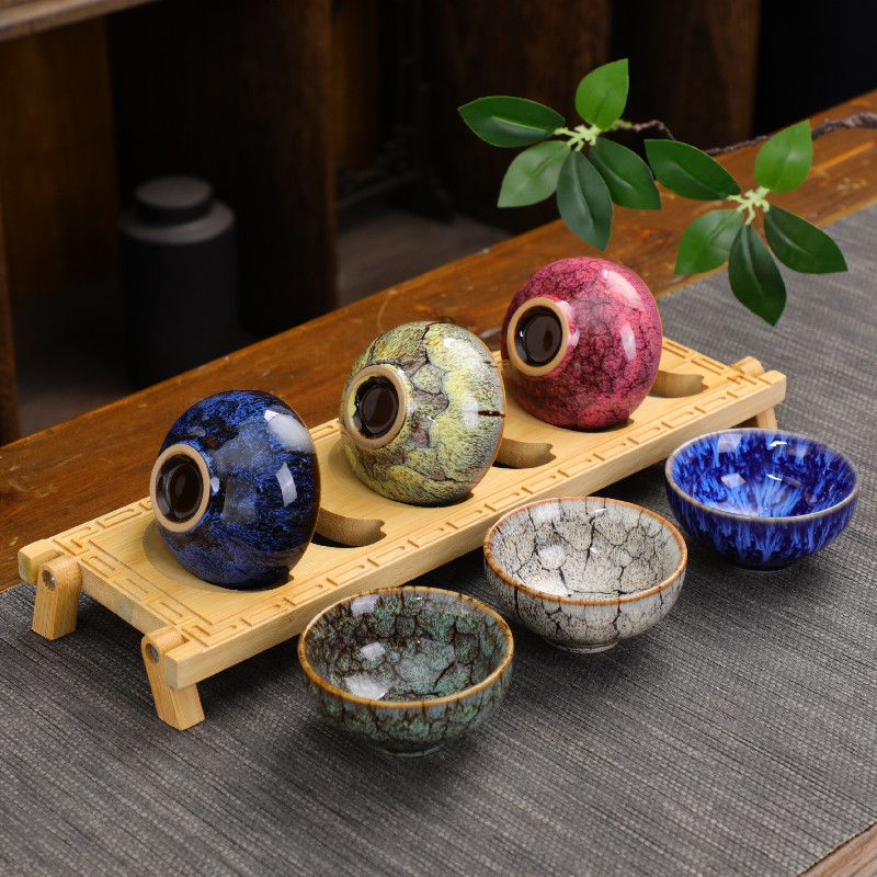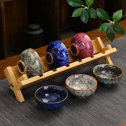 天目釉陶瓷茶具小茶杯 建盏茶碗茶盏主人杯窑变品茗杯6只装带杯架