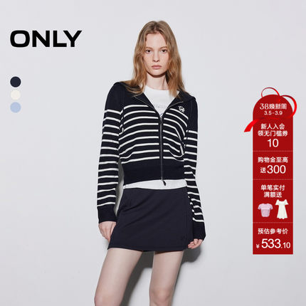 ONLY2026春季新款条纹双向拉链舒适亲肤立体连帽开衫针织衫女