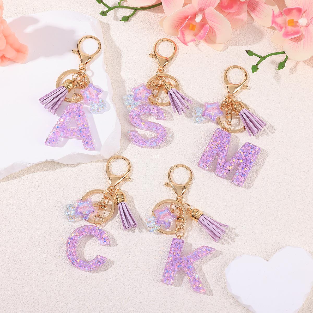 新款时尚紫色字母钥匙扣星星亮片星星流苏水晶滴胶挂件女士钥匙链